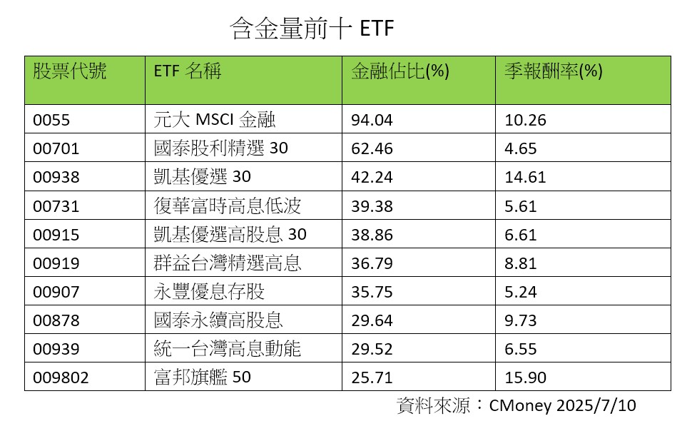 盤點台股ETF,有44檔持有金融成分股,其中「含金量」最高的前五名ETF包含元大MSCI金融(0055)、國泰股利精選30 (00701)、凱基優選30 (00938)、復華富時高息低波(00731)、凱基優選高股息30(00915),金融持股比例均超過38%。