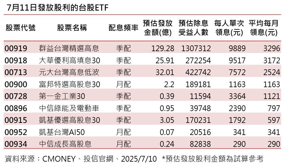 包含00919群益台灣精選高息在內,今天一共有9檔發放股利,合計發放194.1億元現金股利入帳,預計251萬6416位受益人,一早就被錢給香醒,也成為台股潛在的資金動能。
