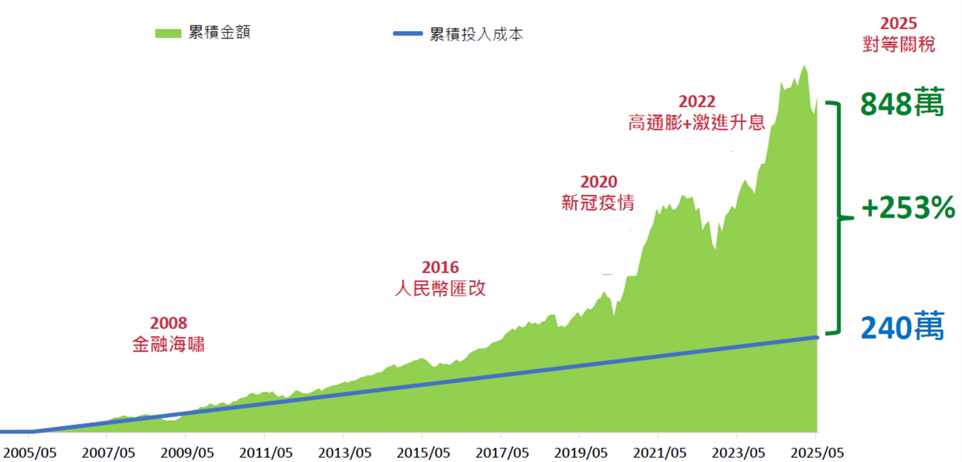 國泰投信ETF研究團隊表示,以台股20年來的數據估算,如果每個月堅持定期扣款1萬元,累積到今年5月報酬率達253%,代表投入僅240萬,但投資成果有望累積至848萬元,複利效果驚人。
