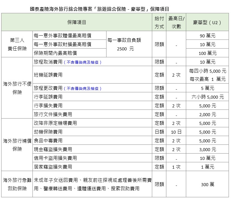 在「旅遊不便險」部分,「豪華型」提供班機延誤每4小時理賠補償5000元,每次最高1萬元。