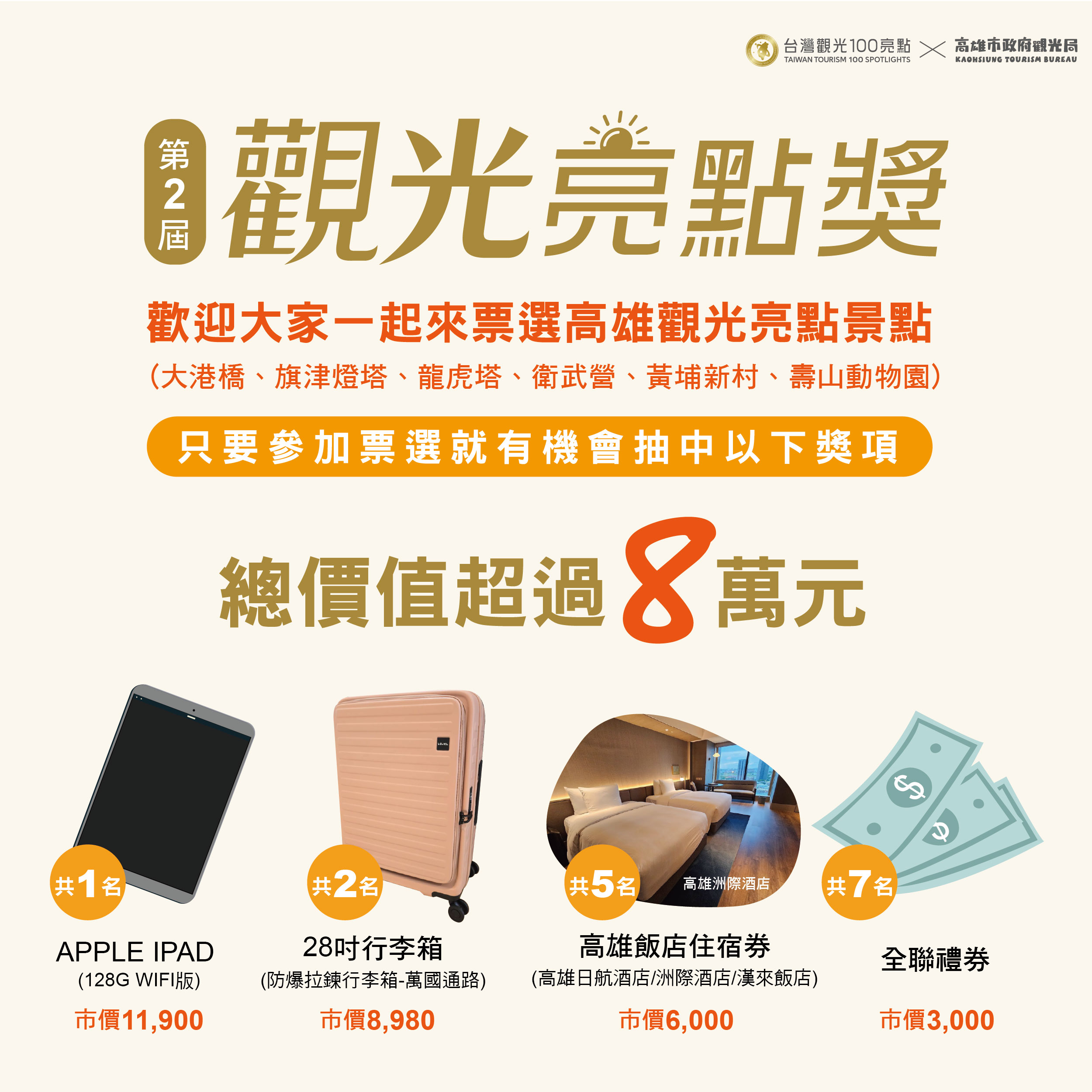 投票活動將持續至7月31日止,民眾每日可投兩票,參與者只需加入「台灣觀光亮點」LINE官方帳號,即可獲得抽獎資格。高市觀光局加碼抽出15組獎品,包括Apple iPad、28吋行李箱、高雄知名飯店住宿券與全聯禮券等,期盼全民一同為高雄觀光發聲,攜手讓城市之光綻放全台。