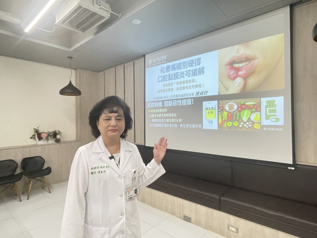 奇美醫院麻醉部部長陳貞吟醫師指出,許多病人在接受化療或放療後,會出現口腔黏膜炎症狀,包括紅腫、破皮與潰瘍,進而造成吞嚥困難、食慾不振甚至無法進食,嚴重影響營養狀態與身體復原。這些症狀不應只是「硬撐」,而是應及早介入治療與營養補充,改善症狀、縮短恢復時間。