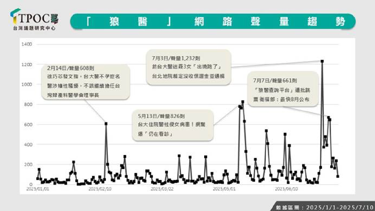 聲量最高點出現在7月3日(1,232則),前台大婦產科醫師鄭文芳被控迷姦3女,卻在繳納40萬元保證金後出境未歸,遭台北地院通緝,引發網路輿論炸鍋,質疑司法效率與監督機制不夠嚴謹。緊接著在7月7日(661則),綠委質疑衛福部「狼醫查詢平台」進度延宕,一來一往的交鋒,再度掀起輿論戰火。