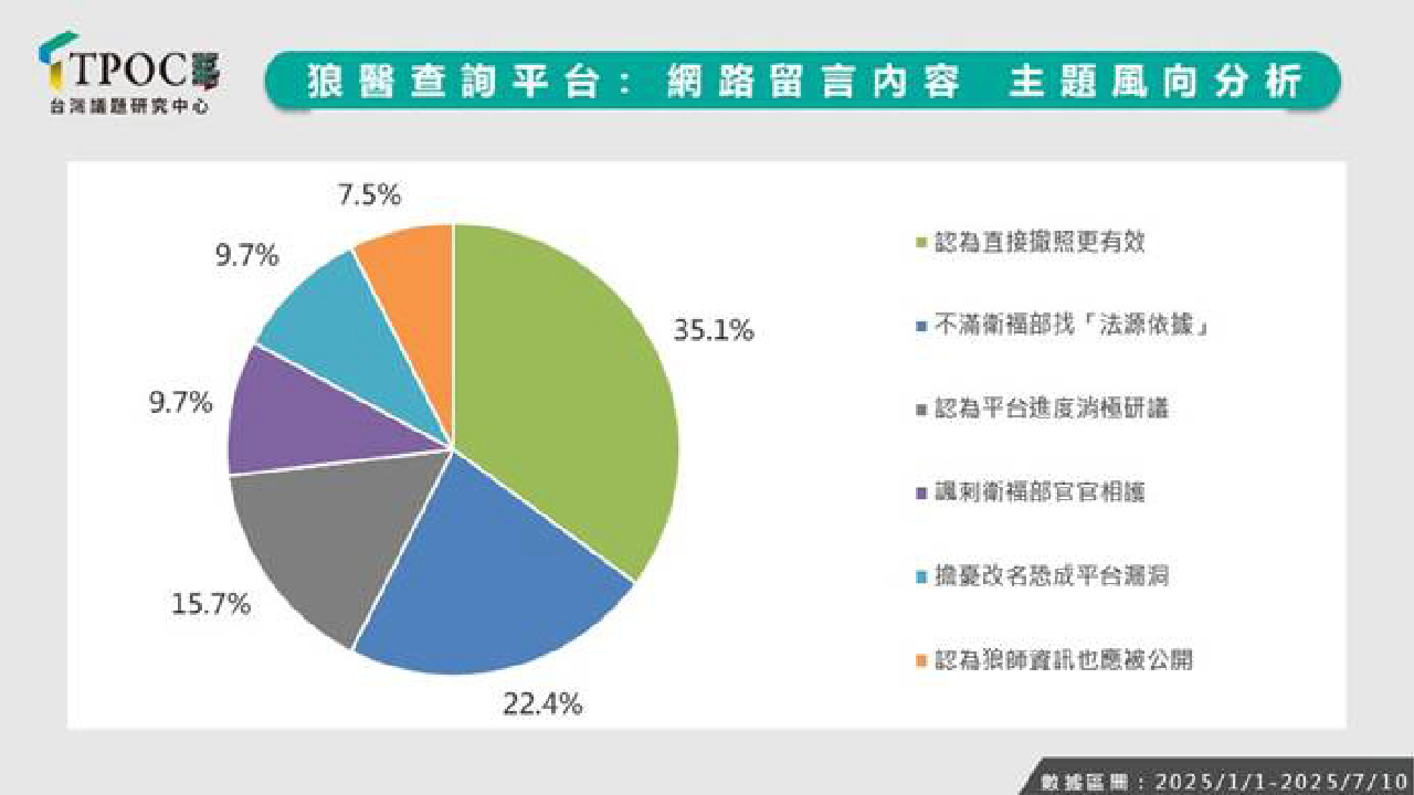 儘管衛福部預告「狼醫查詢平台」最快8月開放查詢,網友對此仍抱持不同觀點,整體討論可歸納為六大主題。其中,近四成(35.1%)「認為直接撤照更有效」,指出僅靠查詢平台無法真正遏止醫師濫權行為,唯有祭出更具懲戒力的措施,才能鞏固醫病信任。其次有22.4%「不滿衛福部找法源依據」,顯示網友對於政府「受限法規」的說法感到不耐;另有15.7%「認為平台進度消極研議」,諷刺研議等同於拖延戰術。
