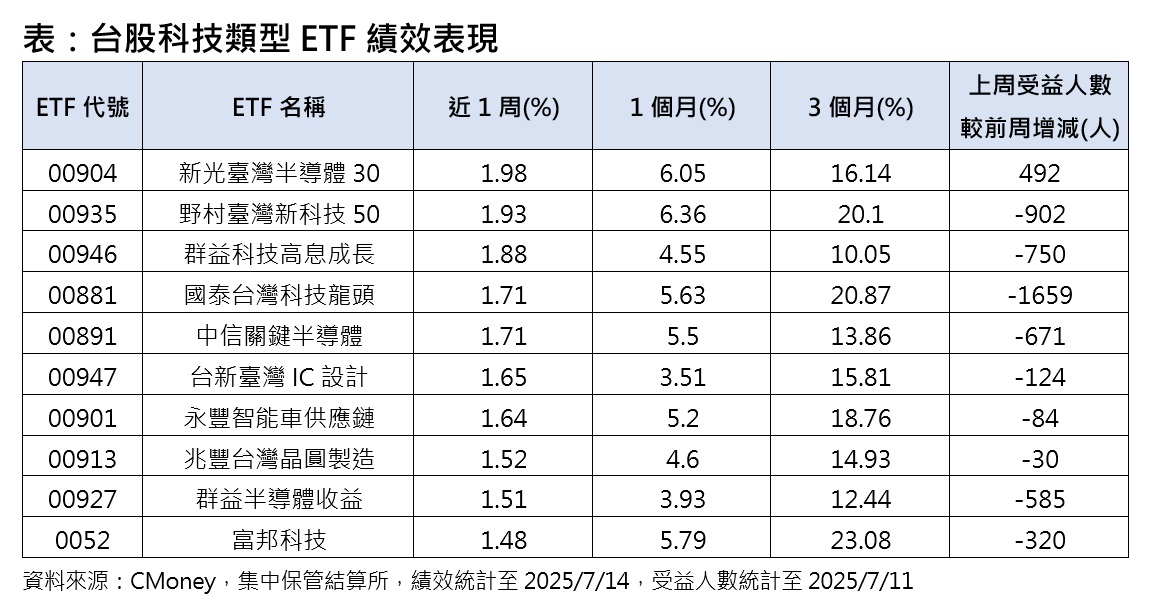 根據CMoney統計,近1周台股科技類型ETF績效表現翻紅,漲幅最高的前10檔ETF,其中與半導體相關即佔5檔,其中,又以新光臺灣半導體30(00904)表現突出,近1周、1個月績效在同類型ETF名列前茅,且上周受益人數也較前1周呈淨成長,績效及買氣都有表現。