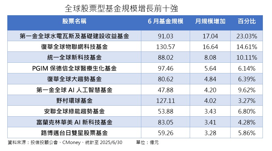 另一頭,台灣上架的全球股票型基金,6月規模增加的人氣基金,投資主題分散在基建、AI、科技等,其中,第一金水電瓦斯及基礎建設基金增加逾17億元,成長23%領先,其次是復華全球物聯網科技基金,6月規模增加16.6億元,成長14.61%緊隨在後。