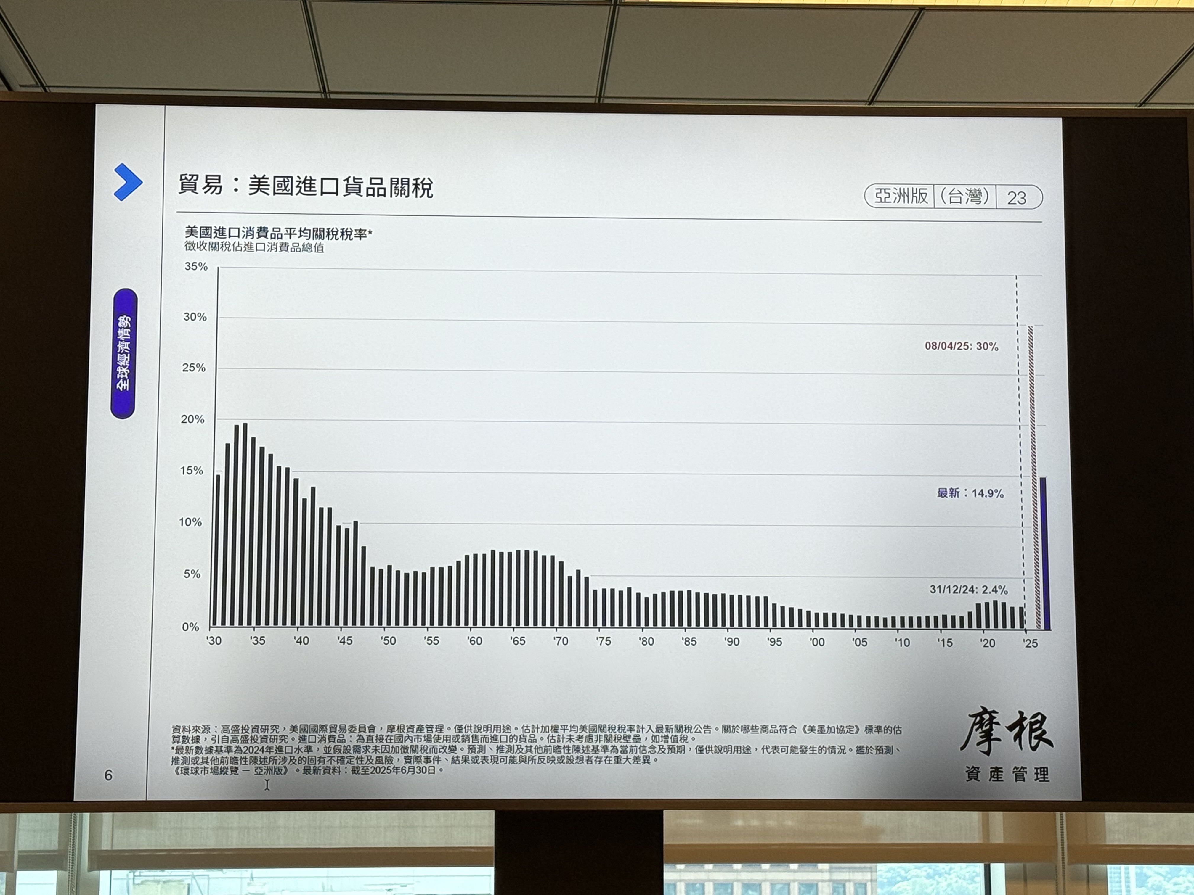 摩根資產管理今天發表年中展望,研判台廠去庫存狀況接近尾聲,企業獲利成績單不錯,但估值不便宜,本益比16.5倍,因此外銷導向的台股,今年可能無法像過去幾年在亞股跑得高,表現可能是中段班,且匯率管理顯得重要,但若AI持續被認同的話,台股表現還是不會缺席。