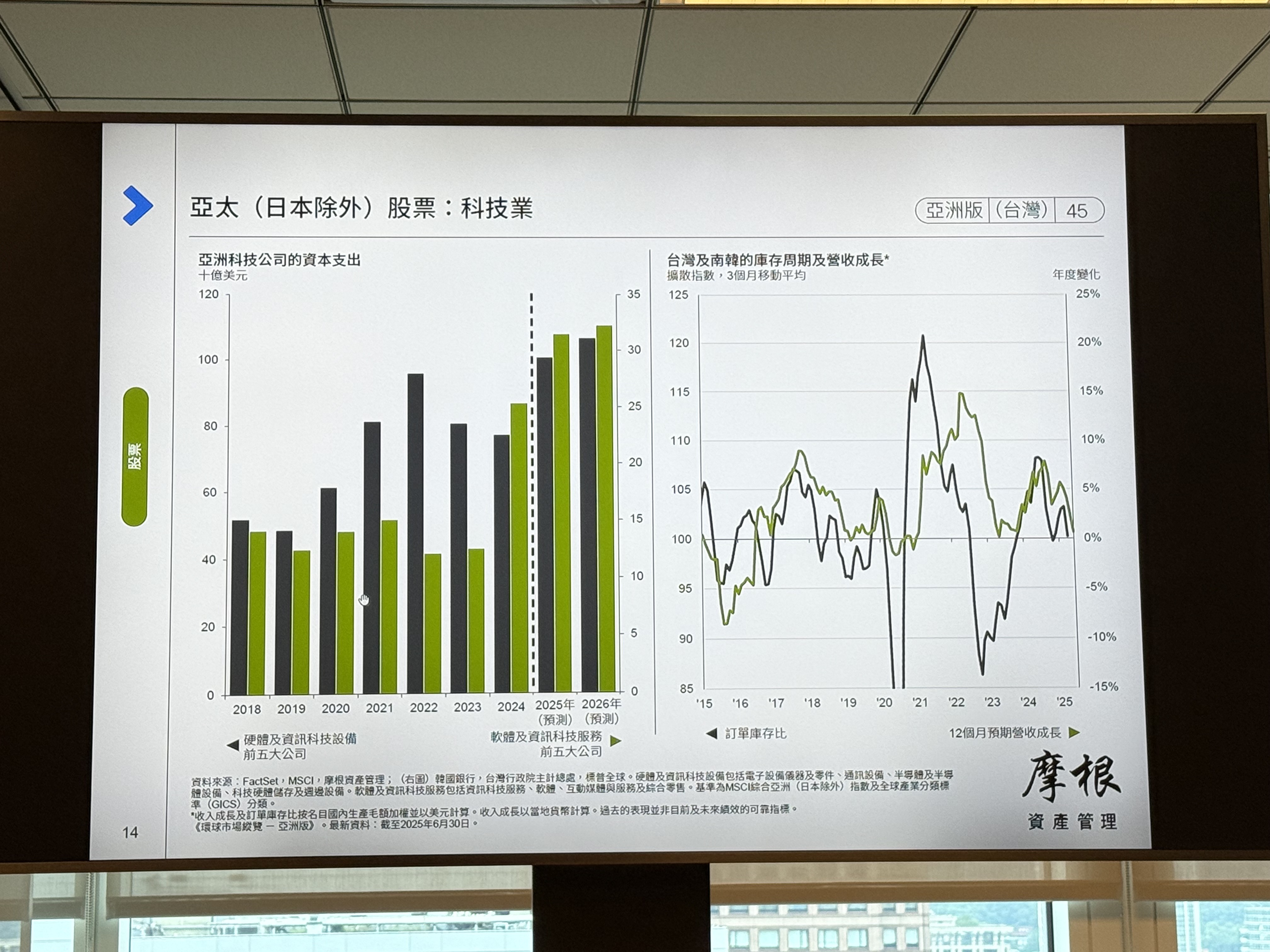 林雅慧表示,亞洲科技股迎來難得的投資機會。特別是亞洲科技公司的資本支出已出現明顯變化,根據統計,前五大硬體與資訊科技設備的公司在資本支出上雖有成長,但軟體與資訊服務公司在資本支出的投入,其金額自2024年起卻已超越硬體與設備商。此外,台灣及南韓的庫存也逐漸去化。(如上圖,記者李錦奇攝影)