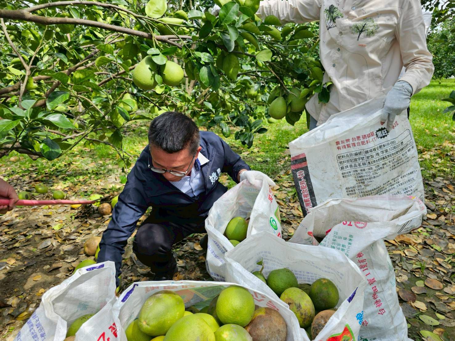 ↑圖說:高雄市農業局長姚志旺也親赴麻豆慰勉青年農民,並捲起衣袖、戴上手套與大家一同撿拾落果。(圖片來源:高雄市農業局提供)