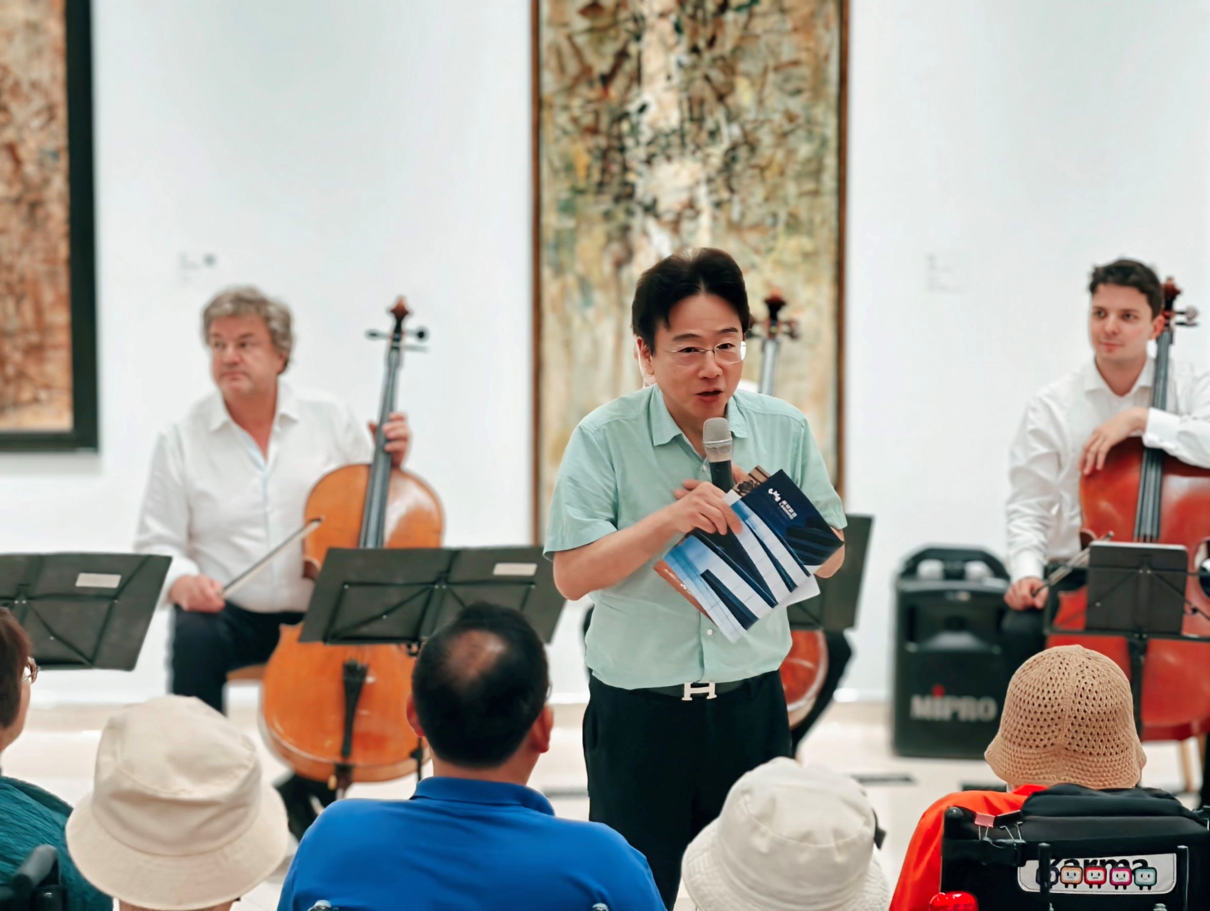 「柏林愛樂12把大提琴」自1972年成立以來,憑藉精湛的演奏技藝屹立世界古典音樂之巔超過半世紀。這次在張老師安排下,結合美術館展示「李德 × 熊秉明」藝術作品,巧妙造就一場結合視覺與聽覺的獨特音樂會。一開場,張老師感性表示始終沒有忘記與輪椅族朋友的約定,由衷感謝中鋼集團共同舉辦輪椅族音樂會,今年已邁入第11年。此外,張老師也謝謝高美館提供這麼好的場地,不僅輪椅族朋友能聆聽最美的音樂,視覺上也享受最美的藝術畫作。
