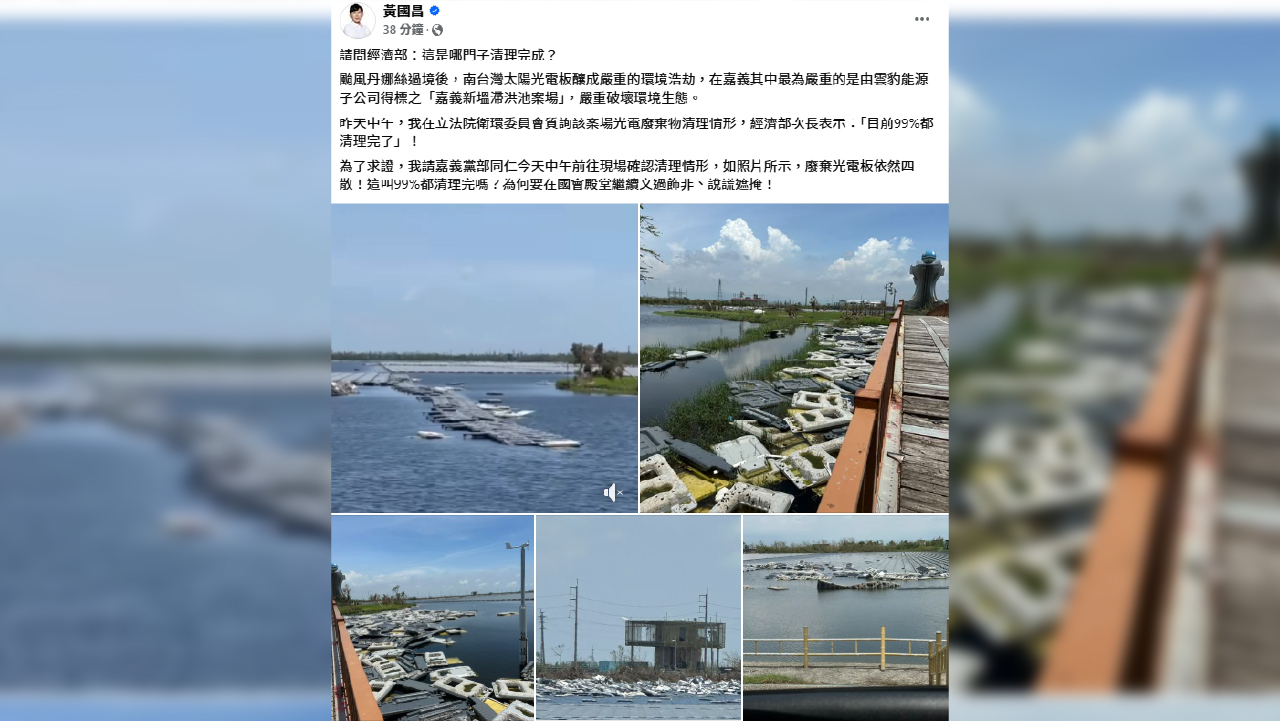 立法院衛環委員會昨(16)日質詢時,經濟部次長對此表示,「案場光電廢棄物99%都清理完畢」,聲稱善後進度良好。然而,立法委員黃國昌今日於臉書公布嘉義黨部實地勘查的現場影片與照片,證實廢棄光電板仍大量四散,現場環境凌亂不堪,與經濟部的說法明顯不符。