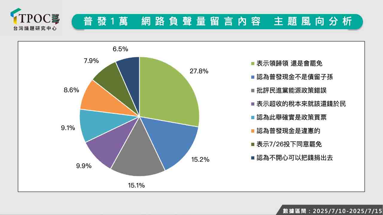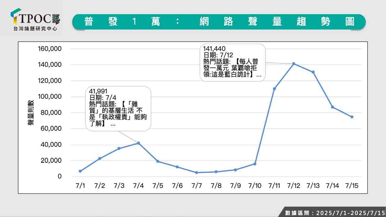 TPOC台灣議題研究中心透過QuickseeK快析輿情資料庫,蒐集今年7月1日至7月15日之間,網路社群平台上關於「普發1萬」輿情聲量數據。整體而言,調查期間半個月內,每日平均聲量約4.7萬多則左右,但直到7月11日立法院正式三讀特別條例後聲量才全面爆發。在前期醞釀階段,第一個小聲量高峰出現在7月4日,熱門話題為國民黨團總召傅崐萁發文諷刺總統賴清德「雜質說」,直言「『雜質』的基層生活,不是『執政權貴』能夠了解」,呼籲賴清德「苦民所苦」,當天聲量超過4.1萬則。而在立法院正式立法後,連續3天聲量都超過10萬則,來到聲量高峰期,如7月12日的熱門話題為民眾呼籲「拒領」普發現金避免落入「藍白詭計」,還有人透過社群平台貼出拒領切結書響應,單日聲量超過14.1萬則,在網路上全面發酵。