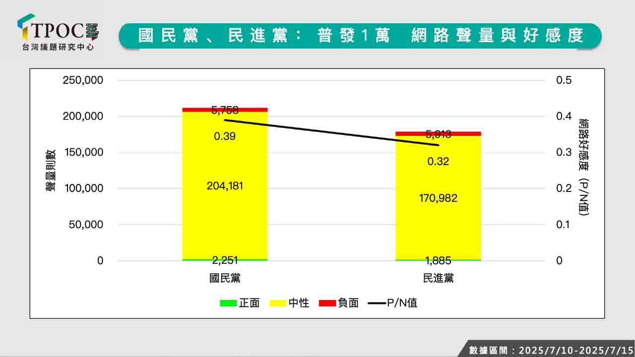 有趣的是,國民黨與民進黨陣營對於普發現金的立場可說是南轅北轍,支持方強調「還錢於民」、「顧民眾荷包」等論述,反對方則質疑與7月26日罷免投票有關,認為是「花你我的錢,救他的罷免」、「債留子孫」,或比較國民黨版特別條例刪除撥補台電預算、增加普發現金,是犧牲「365天供電安全」來發現金。總體而言,在普發1萬的相關討論中,「國民黨」相關聲量達21.2萬則,「民進黨」相關聲量約17.8萬則,國民黨聲量高於民進黨,而好感度方面以0.39稍微領先民進黨的0.32,雙方也積極針對對方論述進行攻防,例如藍營認為政府必須承諾改革能源政策,否則撥補台電只是把人民當提款機,綠營則反擊,稅收若超徵(指實徵數超過預算數)也應按比例分配,不該拿稅金去「買票」。