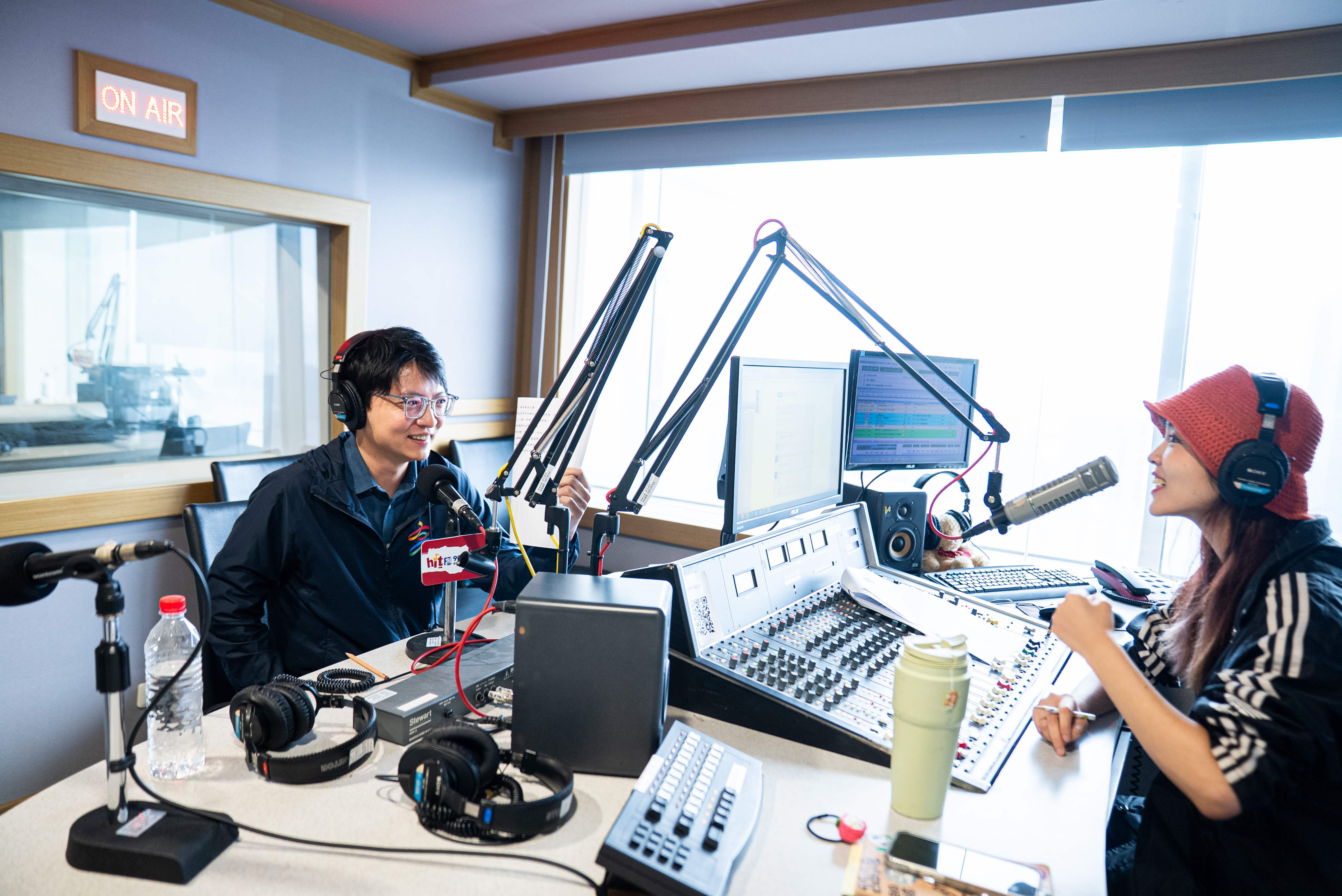 ↑圖說:青年局長林楷軒(左)接受Hit Fm 90.1高屏廣播電台DJ FIFI(右)專訪,並於空中獻「聲」向聽眾介紹「高速青春」培育計畫。(圖片來源:高雄市青年局提供)