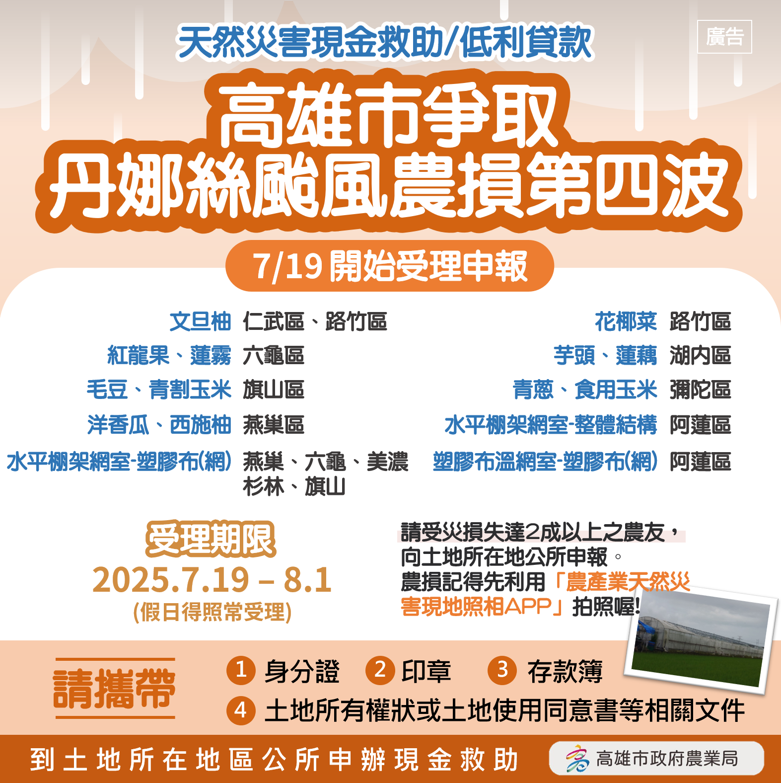 丹娜絲颱風帶來的強風豪雨侵襲,高雄地區農業災情持續擴大,截至18日上午10時,農業損失金額已突破1億1,846萬元。高雄市政府在前3波災損作物申報進行中,再次爭取農業部支持,成功推動第四波農損現金救助方案,涵蓋10個行政區、15項作物及農業設施,農民可自7月19日起至8月1日止,向土地所在地的區公所辦理申報。