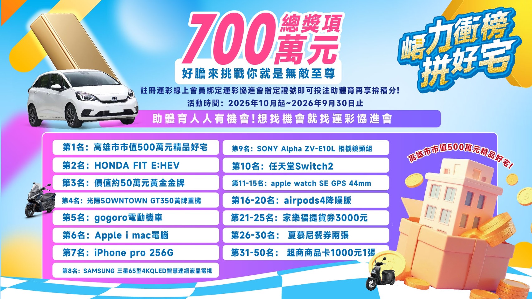 活動現場氣氛高漲,而另一個重磅消息則是揭曉2025年度會員回饋活動「峮力衝榜拼好宅」。自2025年10月1日起至2026年9月30日止,凡參與台灣運彩投注,累積一定資格者,即可參加總值高達700萬元的超豪華獎項競逐。最大獎項直接送出一戶新房,免抽籤、無門檻,全額奉送,堪稱史無前例。此外,還包括市值近百萬元的汽車、價值50萬元黃金、黃牌重機、iPhone等好禮,吸引力十足。