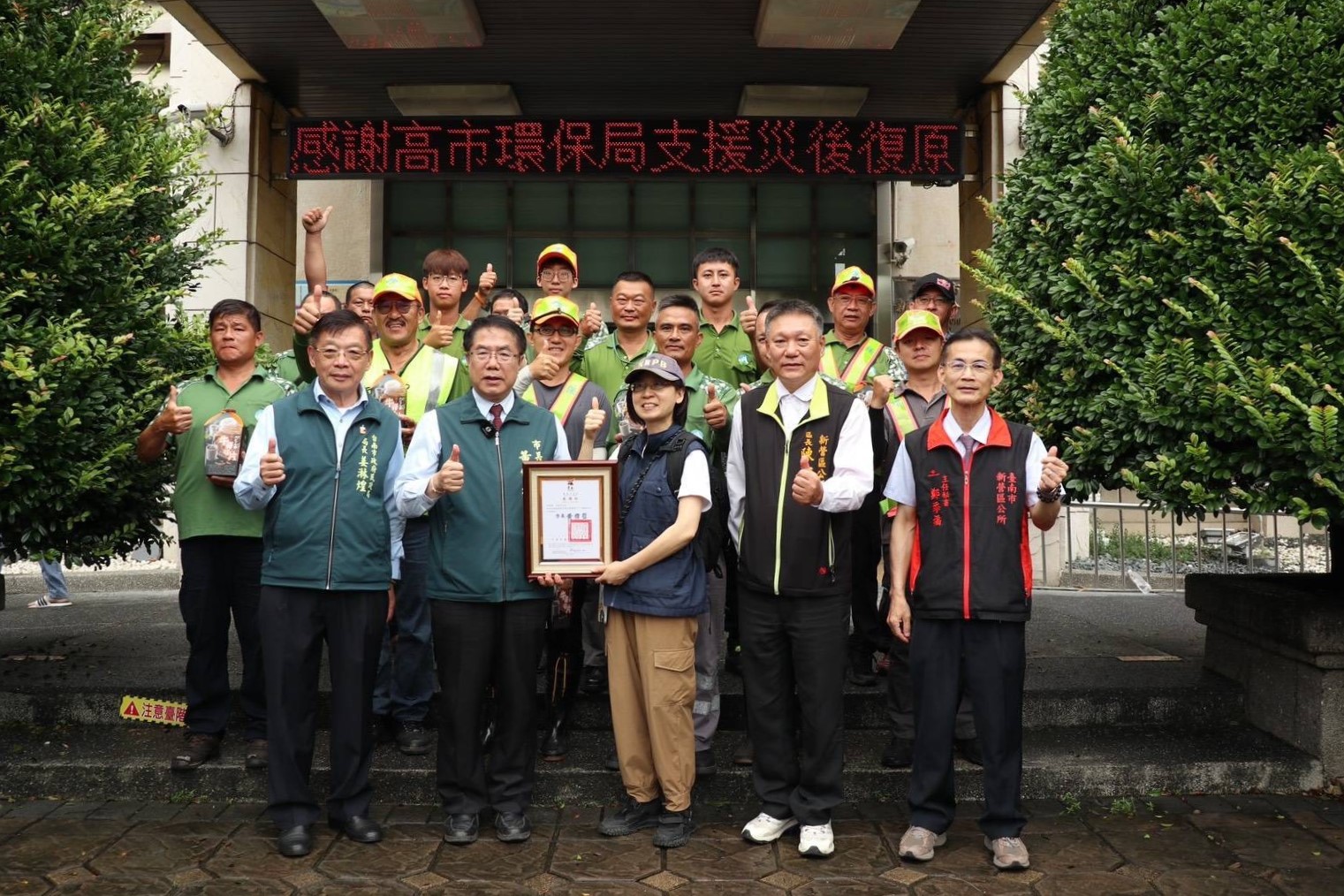 ↑圖說:台南市長黃偉哲向前來支援的高雄市環保局人員致贈感謝狀。(圖片來源:高雄市政府提供)