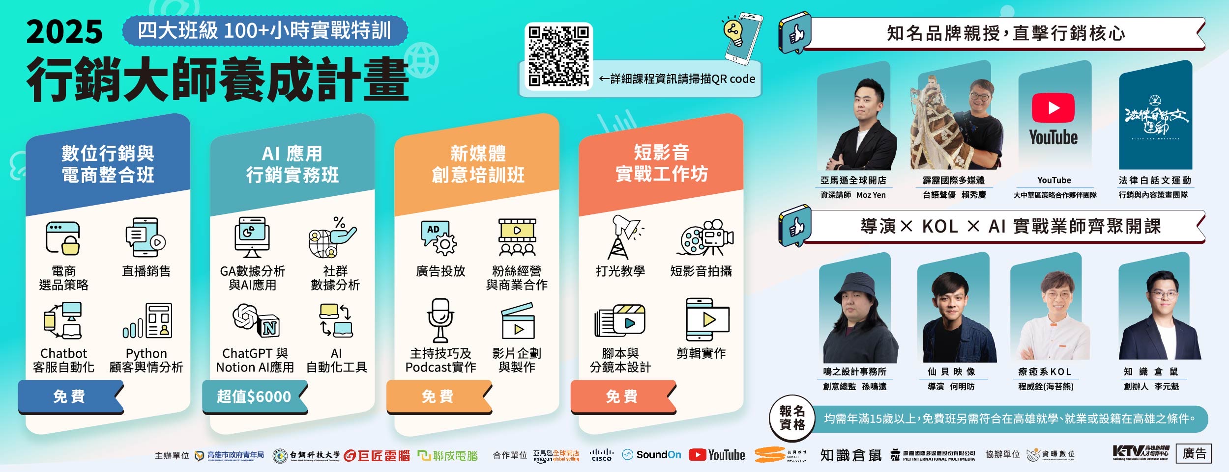 在數位浪潮席捲與自媒體崛起的時代,高雄市政府青年局持續為青年職涯賦能,第五屆「行銷大師養成計畫」已正式啟動報名。本年度課程全面升級,導入AI應用模組、串聯短影音製作與數位行銷實務,由「K-TV高雄新媒體人才培育中心」主辦,集結亞馬遜全球開店、YouTube、SoundOn等產業巨頭與人氣KOL聯手授課,打造百小時以上的實戰型教學,幫助青年在創業與就業市場中提升即戰力。