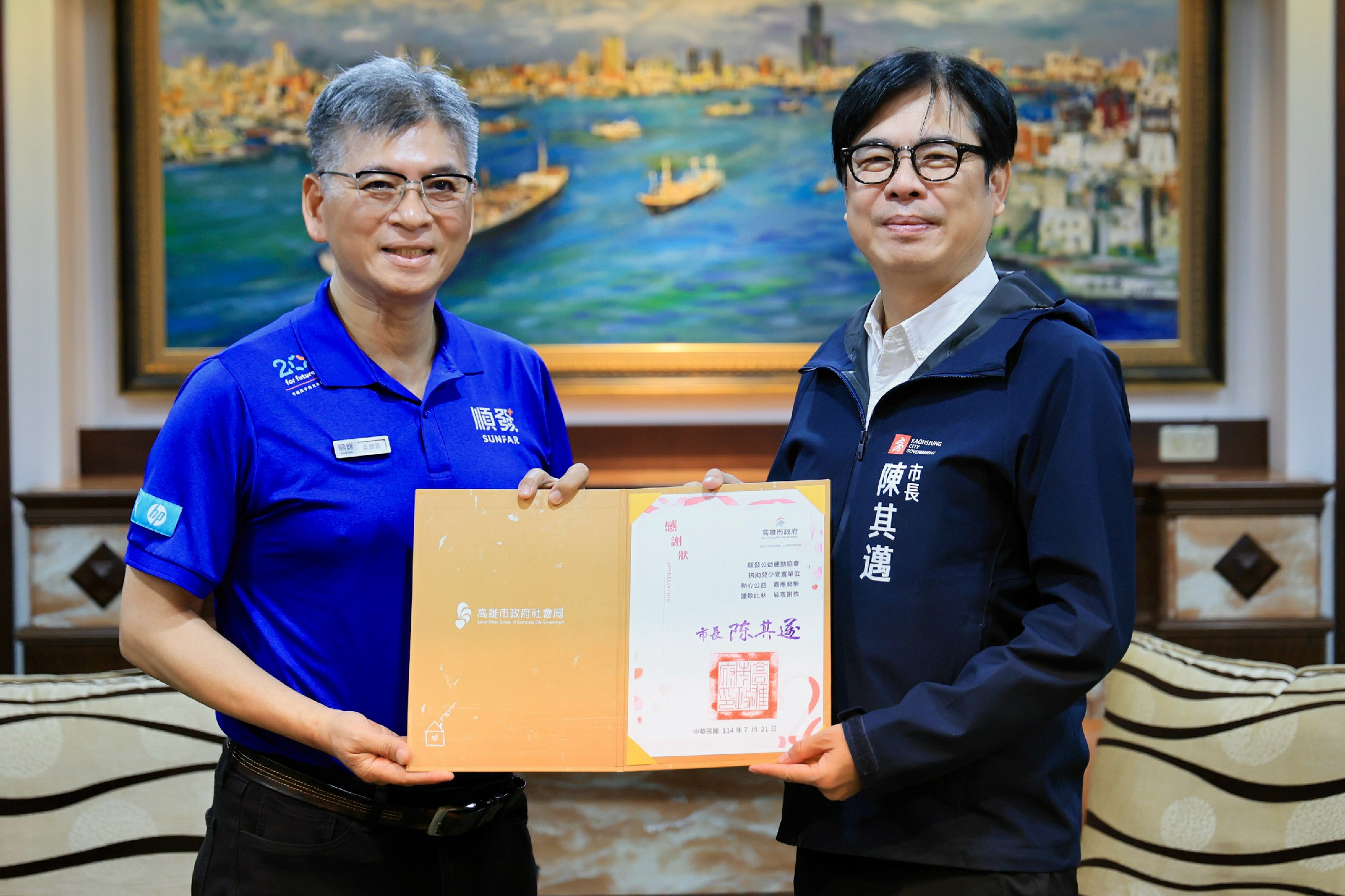 圖說:陳其邁市長致贈感謝狀予順發電腦公司吳錦昌董事長(圖片來源:高雄市社會局提供)