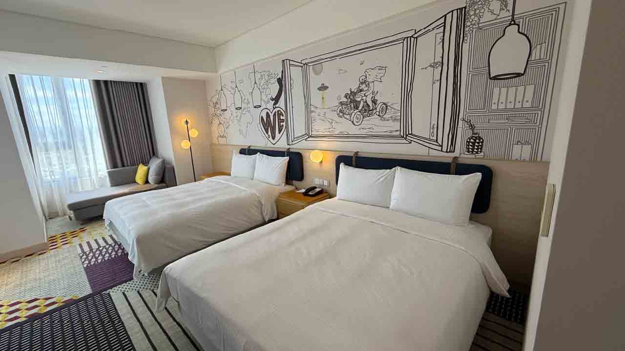 Two Tails Hotel Luzhou座落在捷運中和新蘆線的徐匯中學站樓上,也就是在捷運共構大樓內,如果搭捷運,一出捷運站,直接搭電梯就能上到飯店大廳,距離台北火車站只有16分鐘車程,交通其實十分方便。