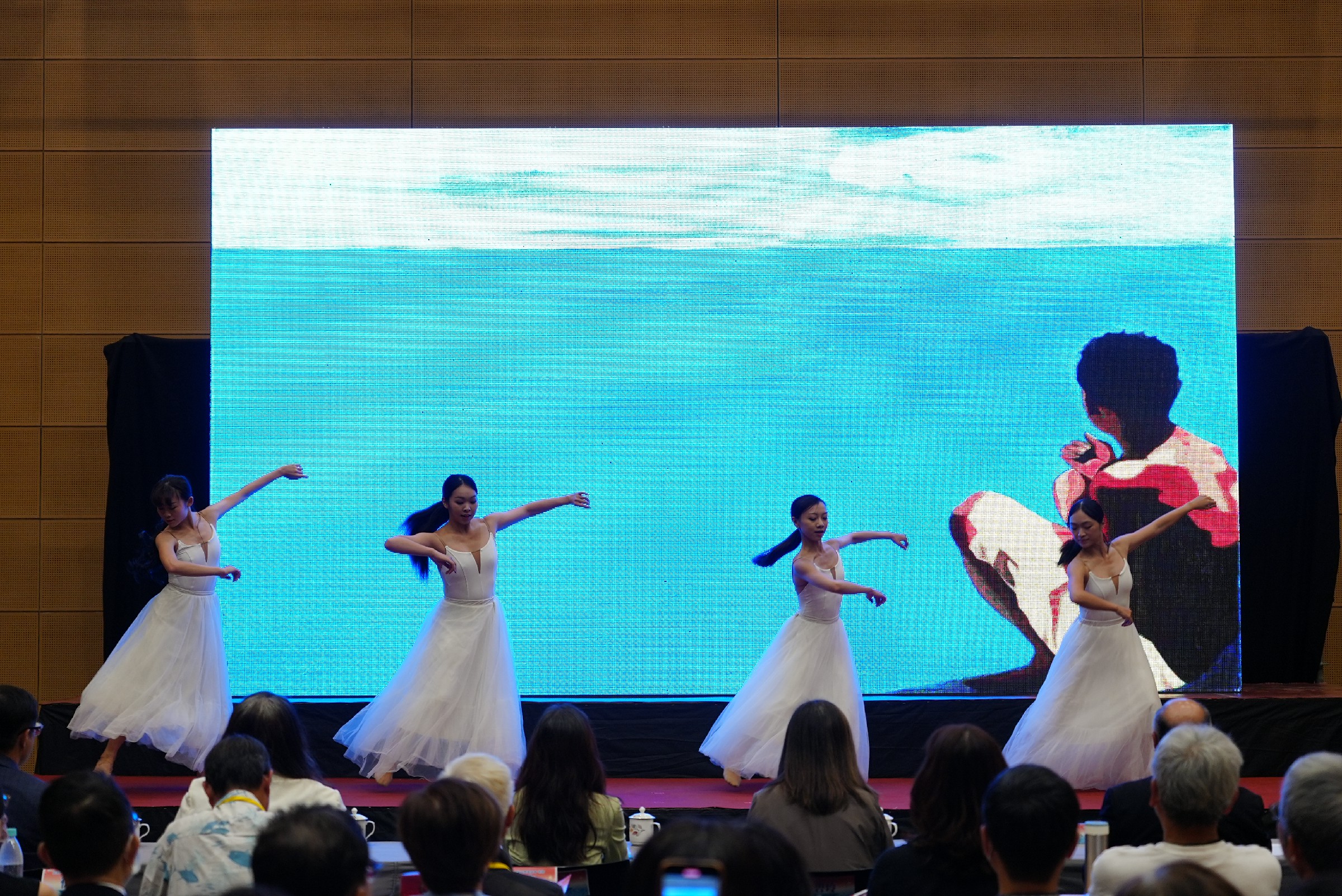 ↑圖說:台灣芭蕾舞團表演,背景為藝術家優席夫老師畫作「守護」(圖片來源:海洋委員會提供)