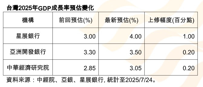 另外,星展銀行近日發布報告,也將台灣今年GDP成長率預估調升1個百分點至4%。