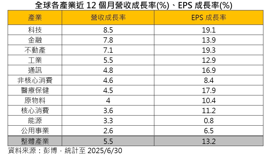 統一投信指出,根據彭博BICS分類統計至6/30,全球科技產業在過去12個月中展現出卓越的成長動能,營收成長率達8.5%,表現遠超其他產業,亦大幅領先整體產業的5.5%。更令人矚目的是,科技產業近12個月的每股盈餘(EPS)成長率高達19.1%,遠超整體產業的13.2%。