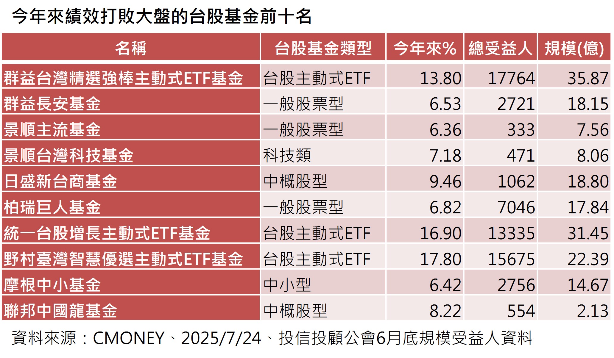 檢視141檔台股基金表現,今年以來有51檔打敗大盤,前十名包括群益台灣精選強棒主動式ETF基金、群益長安、景順主流、景順台灣科技、日盛新台商、柏瑞巨人、統一台股增長主動式ETF基金、野村臺灣智慧優選主動式ETF基金、摩根中小、聯邦中國龍。