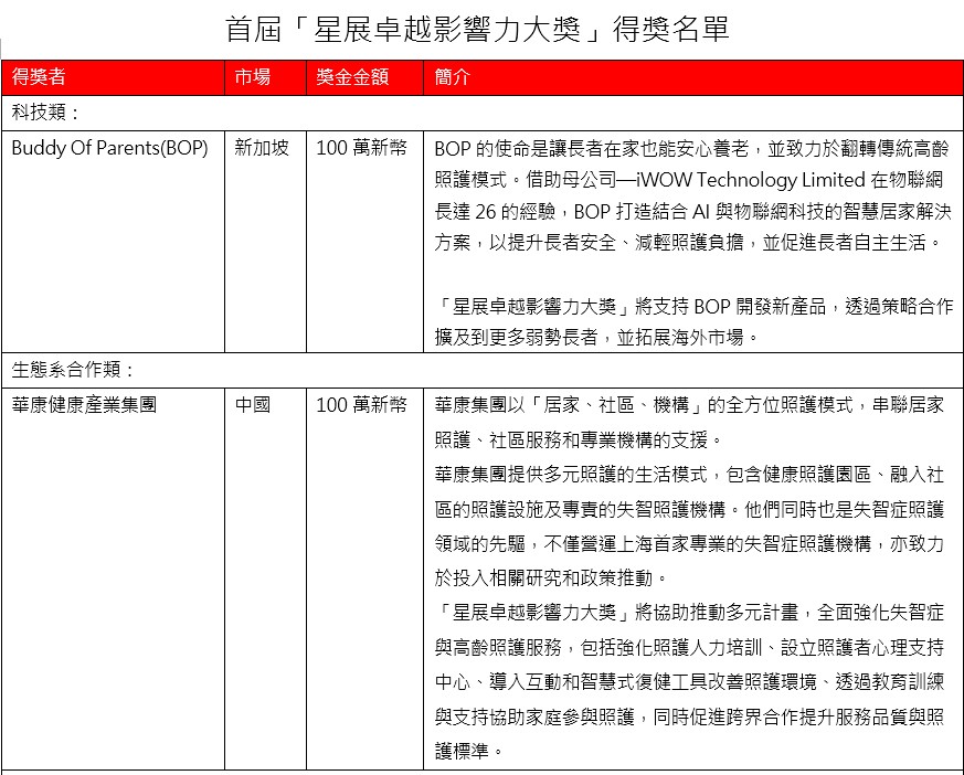 星展指出,這些得獎企業善用科技打造創新解決方案、積極促進公私部門與非營利組織間的跨界合作,以及強化的照護網絡,讓長者得以活出尊嚴並安心地在家中或熟悉的環境安享晚年。