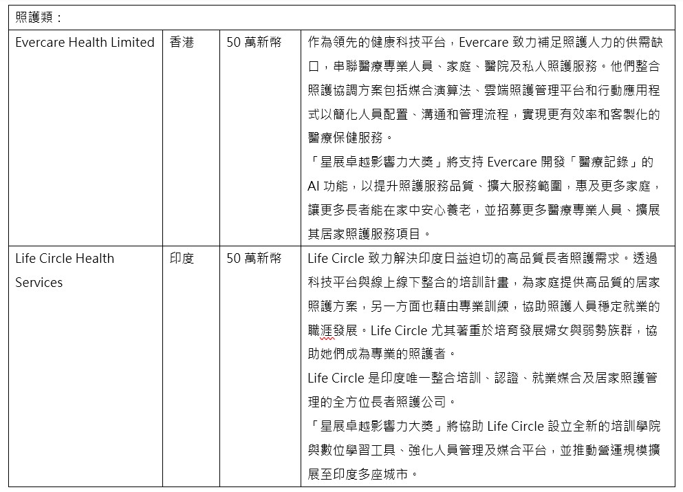 星展表示,此筆獎金將協助獲獎企業開發新產品、擴大營運規模、強化組織運作能力,進一步深化其在高齡社會中的正向影響力。
