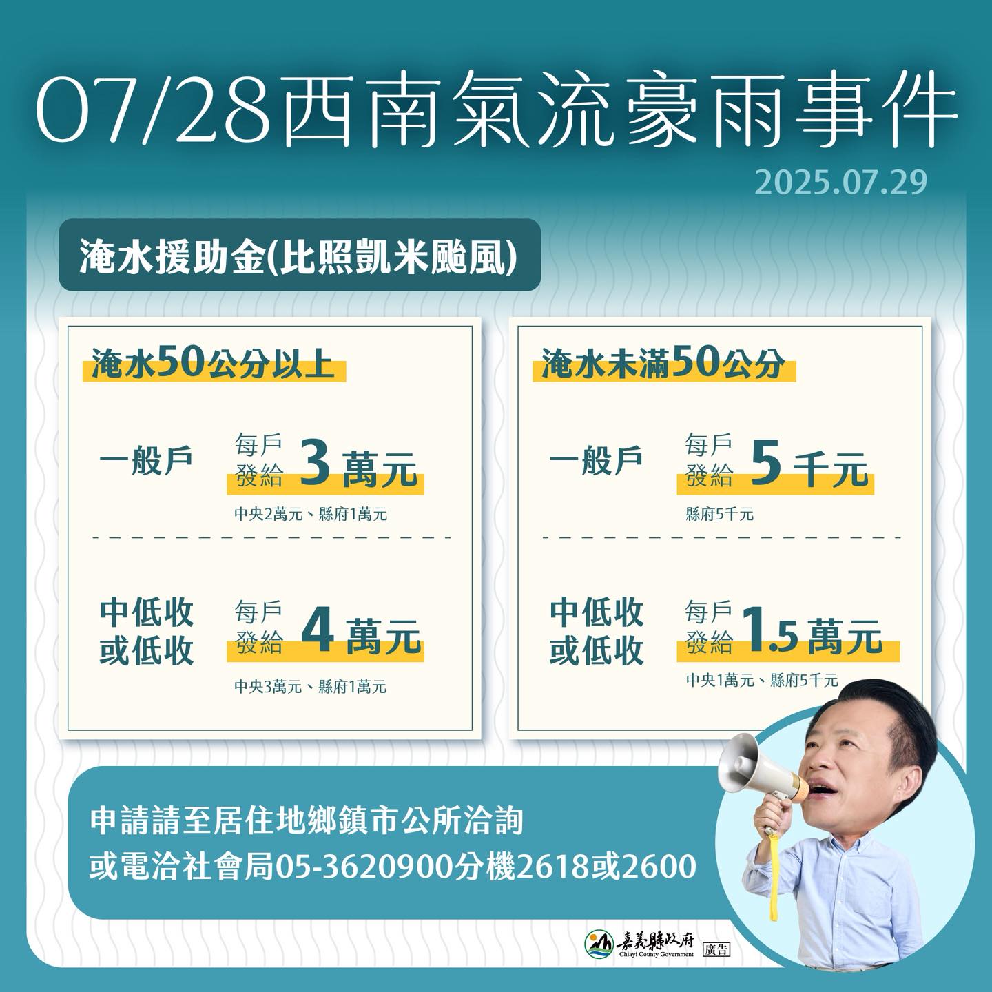 為減輕受災民眾經濟壓力,嘉義縣政府同步啟動「淹水援助金」申請程序。補助標準依淹水深度區分:淹水超過50公分者,一般住戶可申請3萬元,中低收入或低收入戶可申請4萬元;若淹水未達50公分,一般住戶補助5000元,中低或低收入戶則補助1.5萬元。受災居民可向居住地鄉鎮市公所提出申請,或洽嘉義縣社會局專線(05)3620900轉2618或2600。