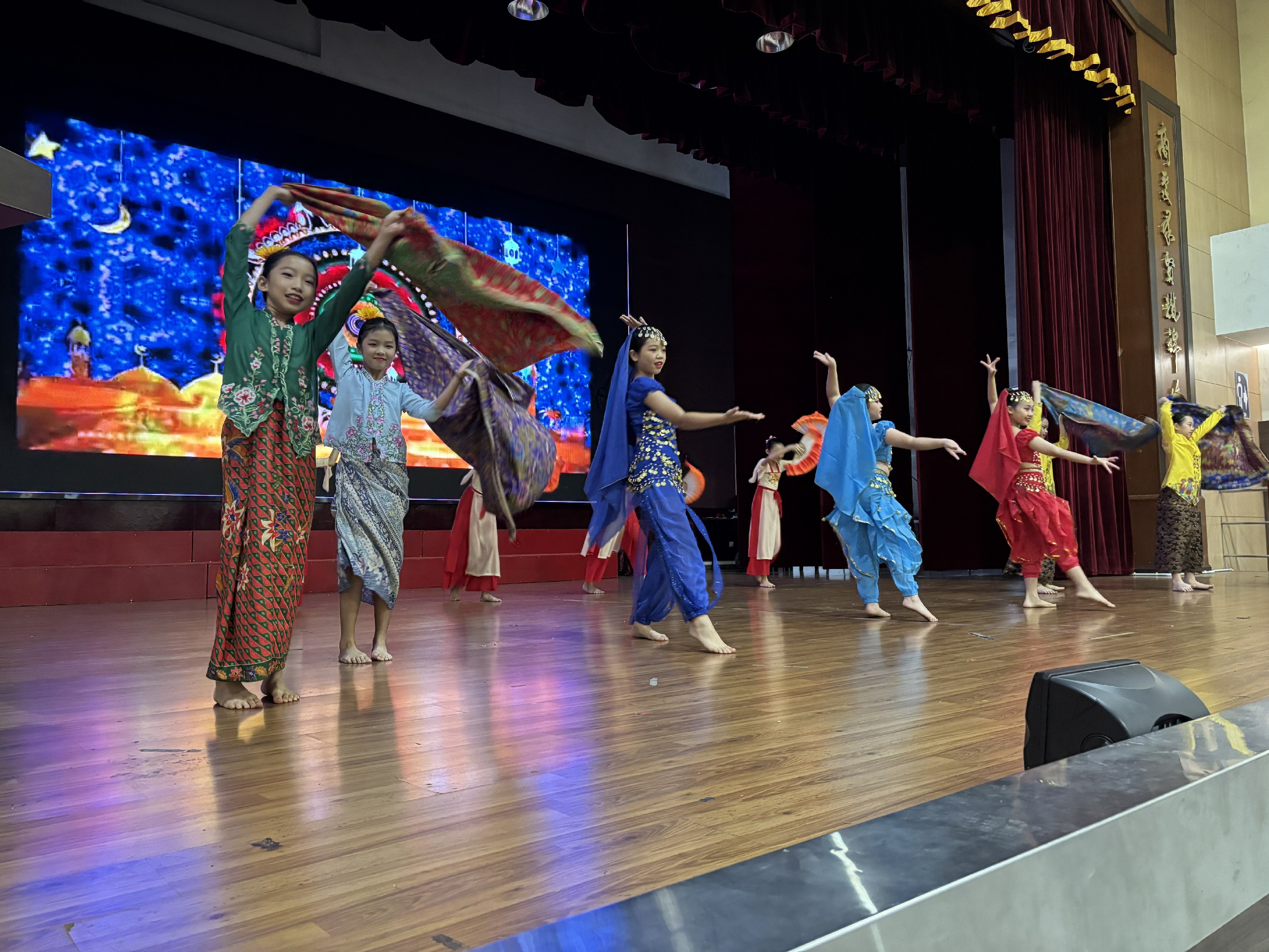 ↑圖說:商務華小學童穿著馬來、印度等傳統服飾表演舞蹈演出令人驚豔。(圖片來源:高雄市客委會提供)