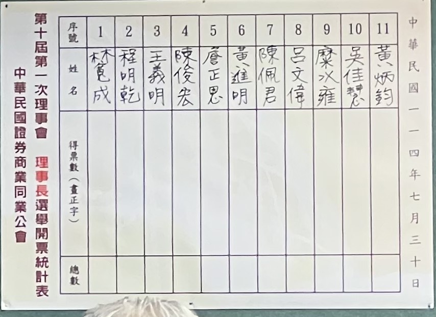 券商公會今天也選出11位常務理事,包括統一證券董事長林寬成,富邦證券董事長程明乾,元大證券副董事長王義明,光和證券董事長詹正恩,華南永昌證券董事長黃進明,兆豐證券董事長陳佩君,麥格理資本台灣證券分公司董事總經理吳佳慧,福邦證券董事長黃炳鈞等人。(如下圖,讀者提供)