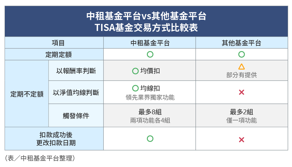 所謂的平台創新交易模式,是指領先業界的「中租靈活扣」定期定額服務,相較於其他平台同業的定期定額、定期不定額機制,「中租靈活扣」特別內建兩項「定期不定額」智慧加減碼進階功能,讓投資人購買TISA基金時可搭配使用,運用市場低檔時增加扣款、高檔時減少扣款的策略,幫助投資人在市場波動中達到優化投資成本、提升報酬機率的效果。