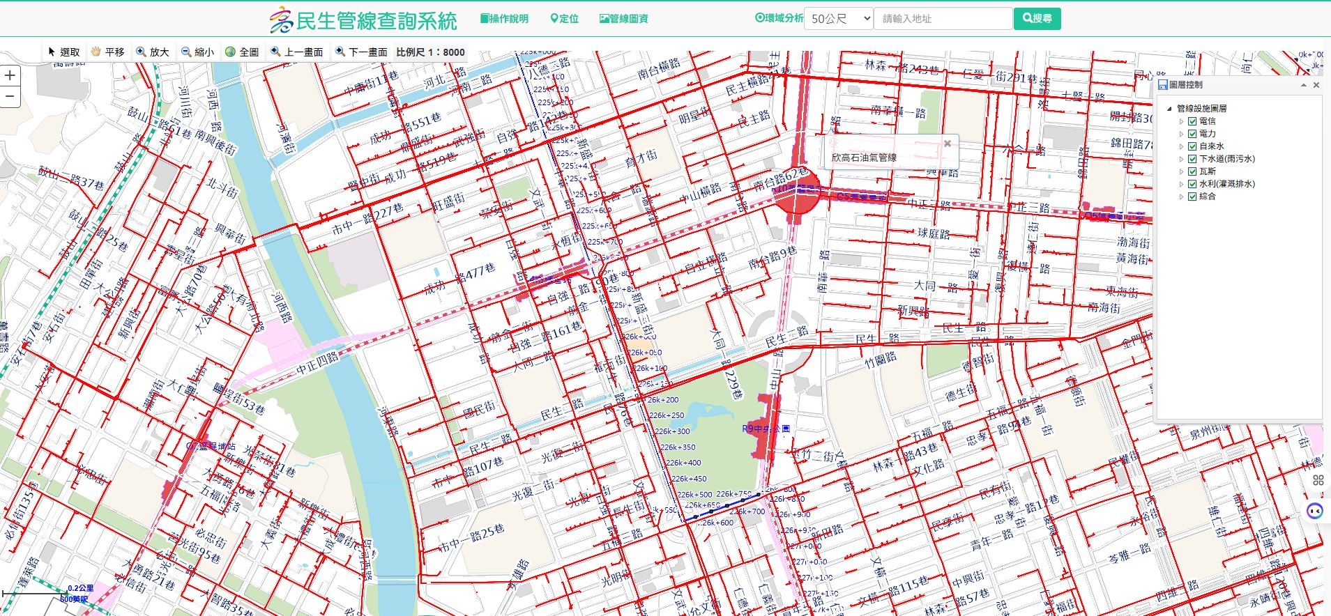 ↑圖說:高雄市道路下方管線交錯複雜,施工不慎便可能影響市民生活安全,故在公共設施管線資料系統會不斷更新與落實。(圖片來源:擷取自高雄市公共管線查詢系統)