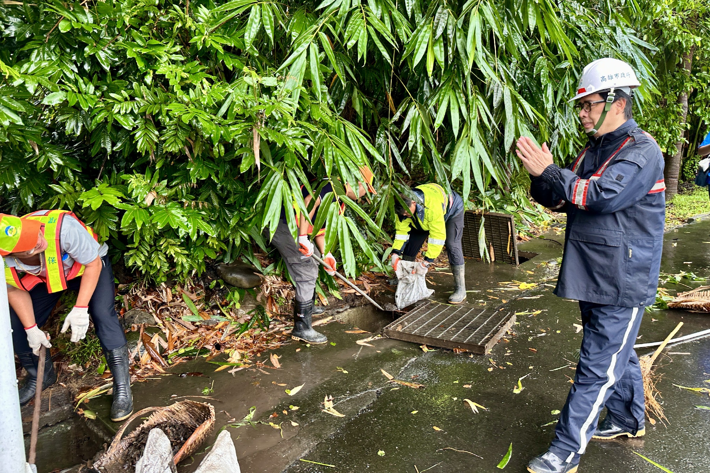 此外,陳其邁也前往第一線慰勉環保局清潔隊員,感謝他們在惡劣天候下仍持續清疏道路側溝、排除落葉與倒木,確保排水系統暢通,並特別叮囑作業人員務必注意安全。