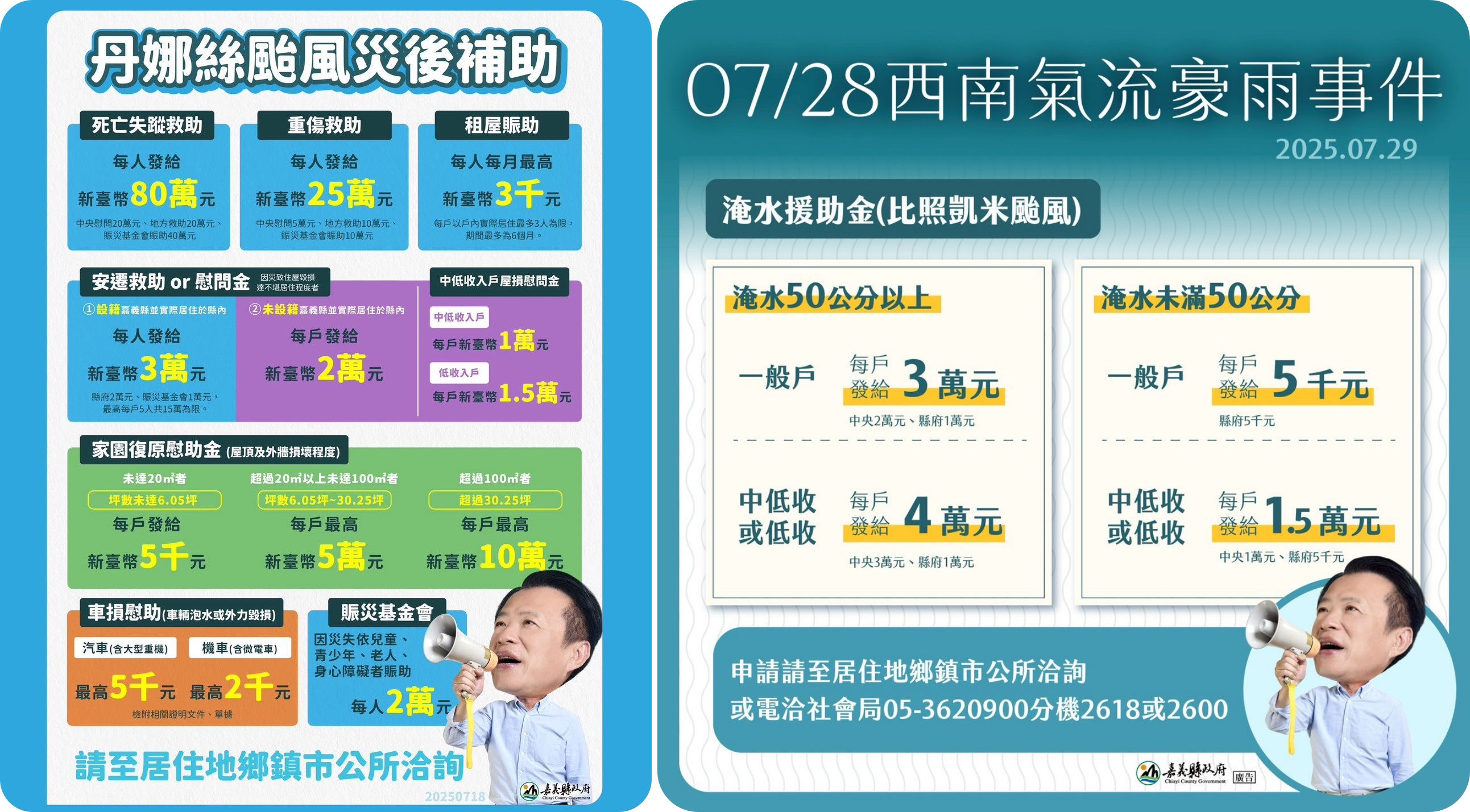 面對丹娜絲颱風與0728西南氣流帶來的劇烈降雨侵襲,嘉義縣多地遭受嚴重水患與基礎設施損壞,嘉義縣政府為協助災區民眾迅速重建生活,已依據《公益勸募條例》第5條開設「丹娜絲颱風捐款專戶」,接受國內外社會各界善心捐款。