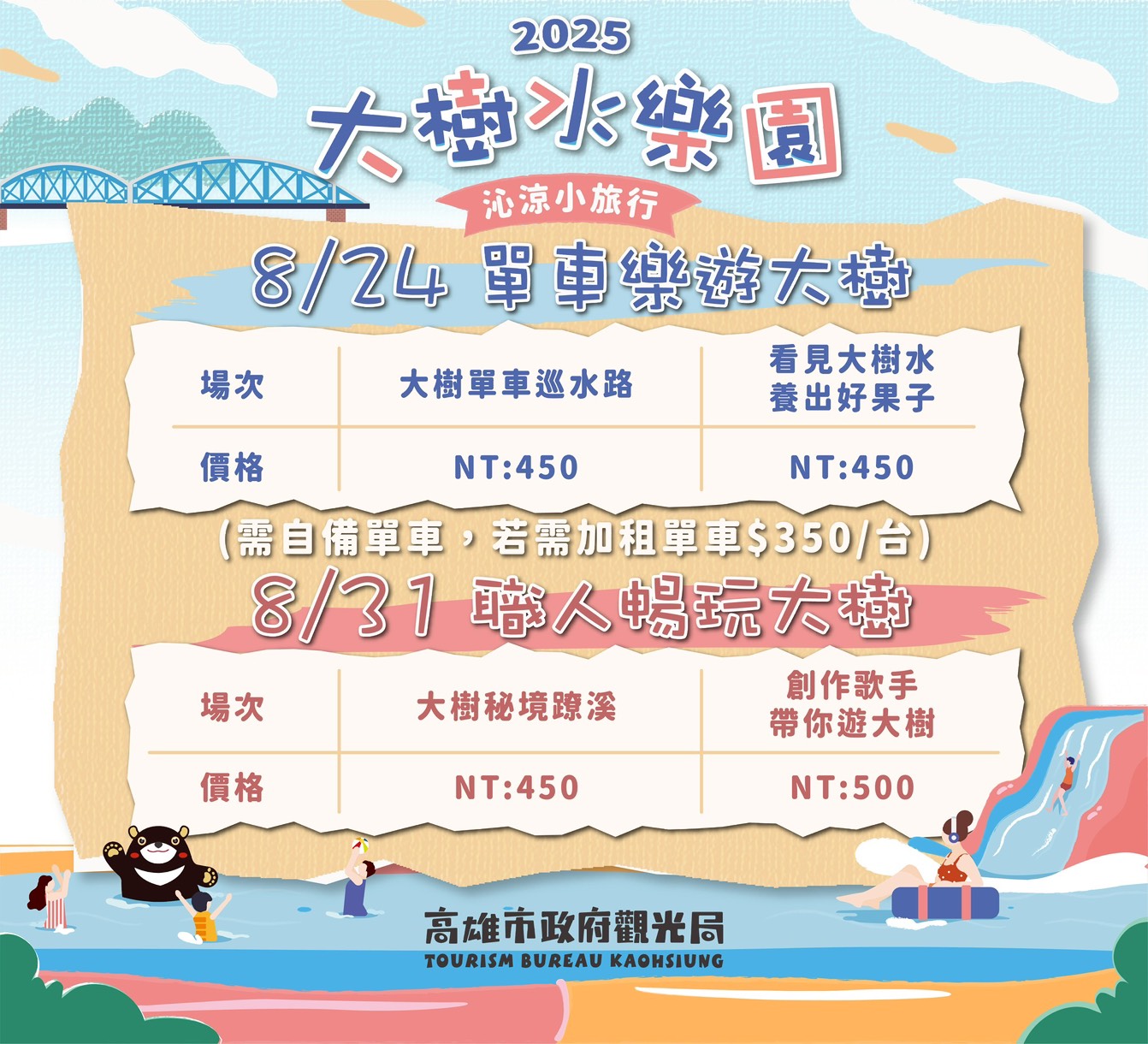 為了能在暑假尾聲留下難忘回憶,高雄市政府觀光局推出「2025大樹水樂園 × 小旅行」系列活動,將農村文化、濕地生態與親水樂趣完美融合,規劃大型戲水氣墊設施與四條主題小旅行,從水脈文化、在地果園、工藝職人到音樂導覽,帶來具深度又沁涼的旅遊體驗。「2025大樹水樂園」系列活動將於8月30日至31日於舊鐵橋濕地公園舉行,主題小旅行分別於8月24日與31日出發,報名於8月4日上午10點開放,名額有限,預料將掀起搶購熱潮。