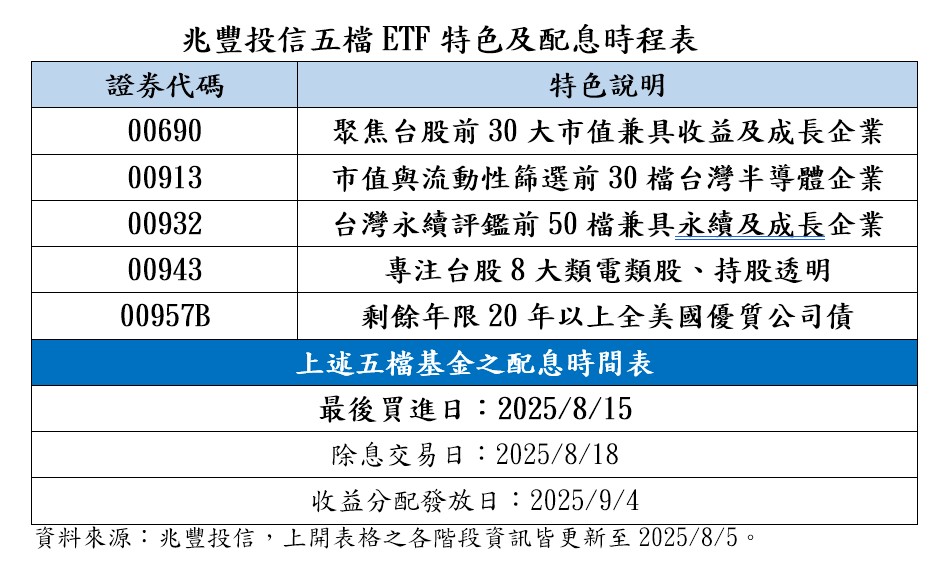 存股領息族請留意!兆豐投信旗下4檔台股ETF,包括兆豐永續高息等權(00932)、兆豐藍籌30(00690)等等,都將在8月18日同步除息,兆豐投信已經公告初估的配息金額,想要參與領息的投資人,最晚要在8月15日買進,就能在9月4日領到錢。