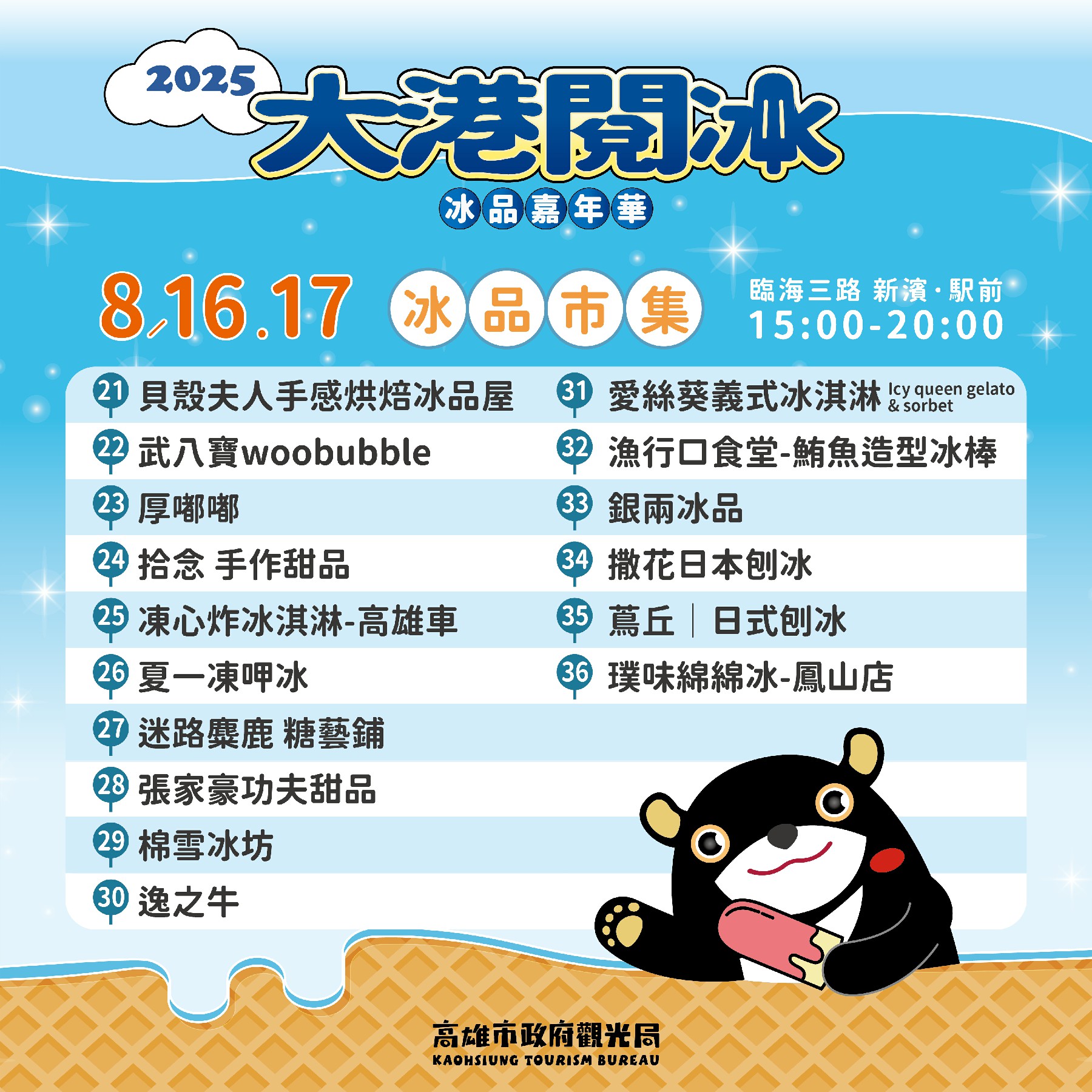 高市觀光局補充,「大港閱冰」不只是美食活動,更是高雄夏季觀光品牌的重要一環。接續9月起還有「高雄雄嗨調酒節」、「高雄奶茶節」,11月的「鹹酥雞嘉年華」及「咖啡節」等一系列城市味蕾行銷。活動期間,旗津亦同步舉辦「風箏節」,另有8月底舊鐵橋濕地公園登場的「大樹水樂園」,提供遊客一站式清涼玩法,打造高雄夏季旅遊黃金期。