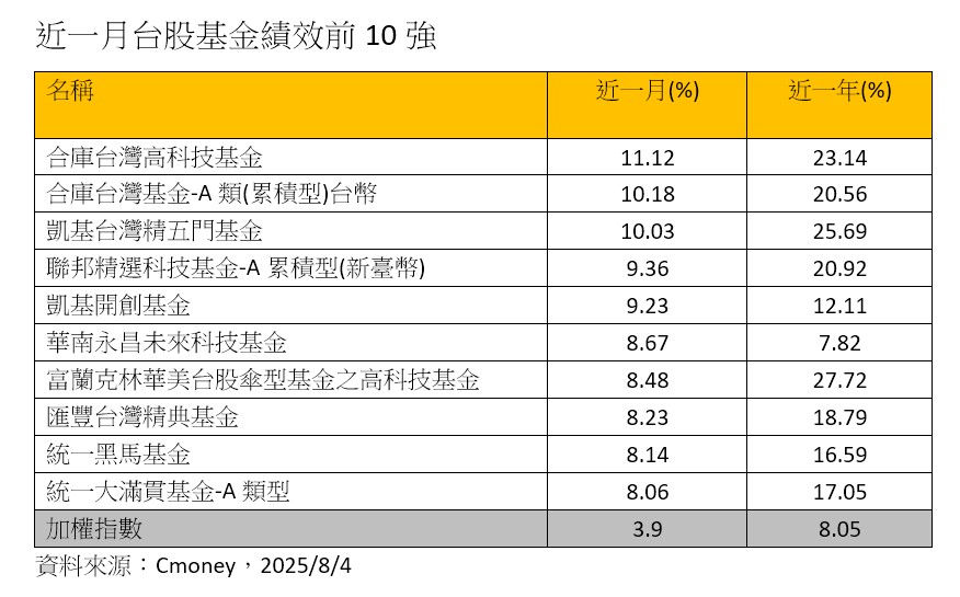 檢視近一月台股基金表現,前十強績效均打敗加權指數,包含合庫台灣高科技基金、合庫台灣基金-A類(累積型)台幣、凱基台灣精五門基金、聯邦精選科技基金-A累積型(新臺幣)、凱基開創基金、華南永昌未來科技基金等等。