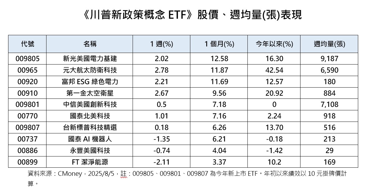 川普2.0時代受惠產業之相關海外股票ETF,績效也有不錯表現,像是鎖定美國電力、國防科技與太空衛星等主題的ETF,包括新光009805、元大00965、富邦00920共3檔,近1個月績效率先突破10%。