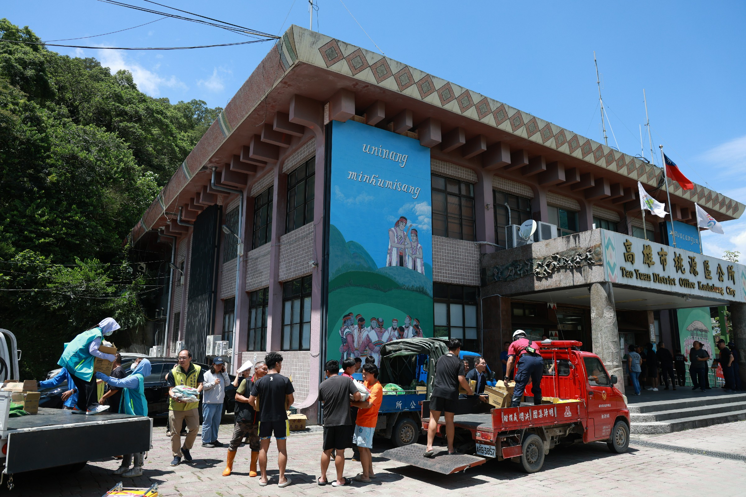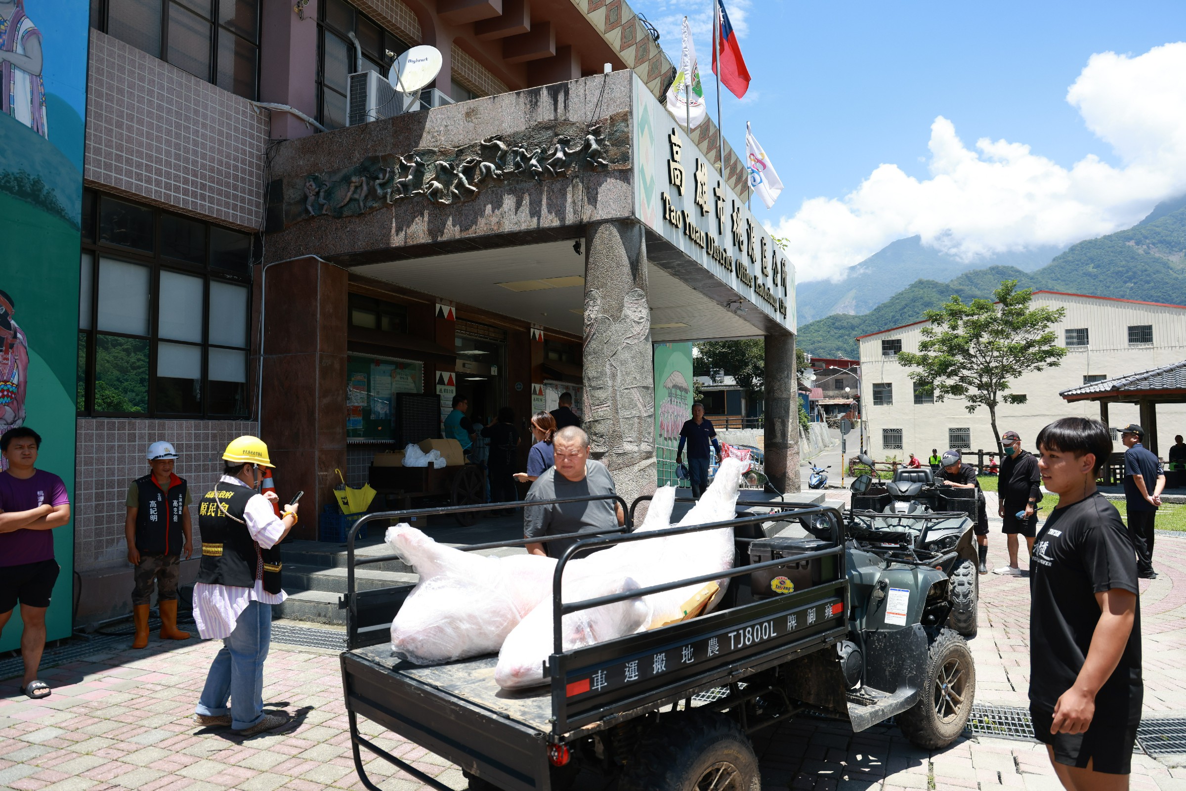↑圖說:多位部落居民駕駛市府先前補助的農用運輸車接駁物資,成為災後運補的主力。(圖片來源:高雄市政府提供)