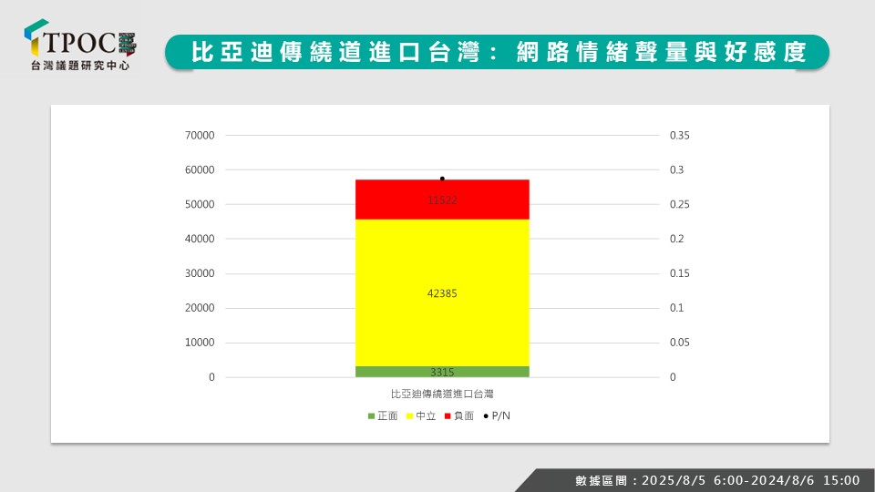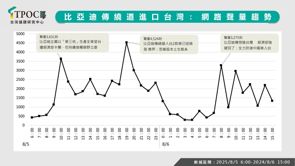 TPOC台灣議題研究中心透過QuickseeK快析輿情資料庫觀察發現,比亞迪來台掀起政治與產業雙重震盪,起初質疑藍營與中國車商接觸,後續更延伸引爆「中國車滲透國安」風暴,讓經濟部部長郭智輝今日強硬表態:「有資安疑慮的車輛,絕不讓它進台灣。」