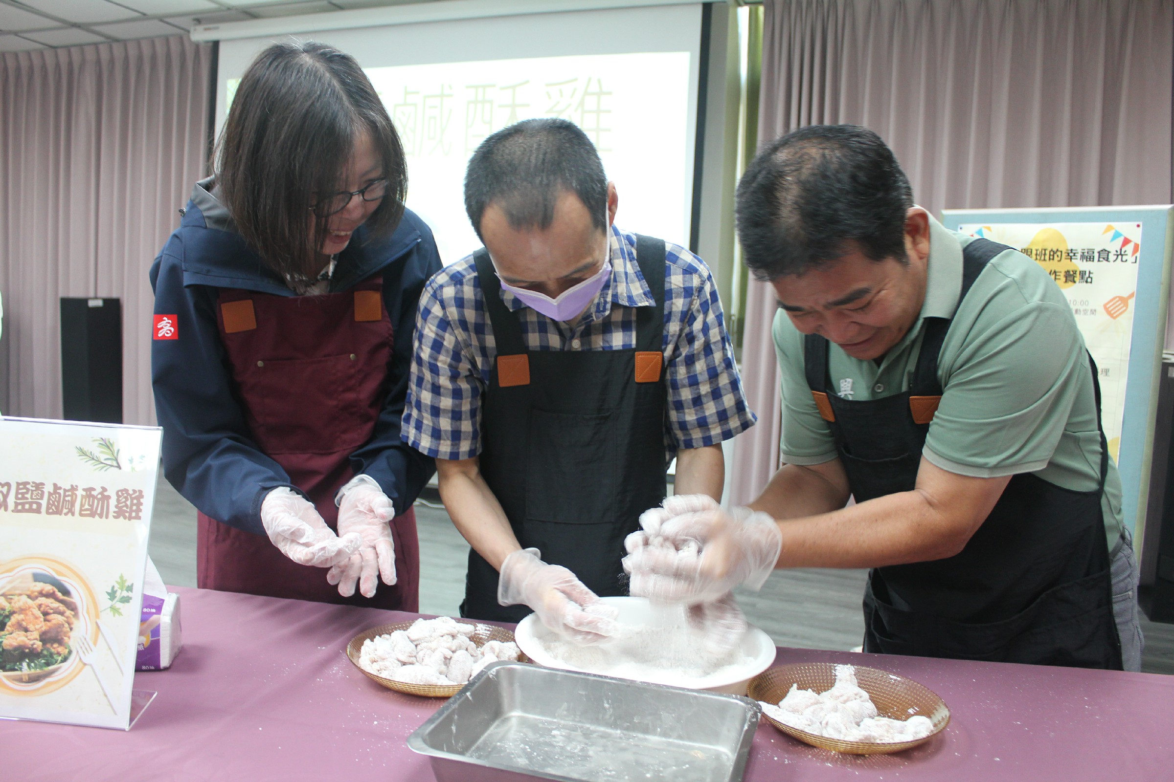 ↑圖說:蔡宛芬(左1)與興邦里薛文龍里長(右1)陪伴憨兒製作椒鹽鹹酥雞。(圖片來源:高雄市社會局提供)