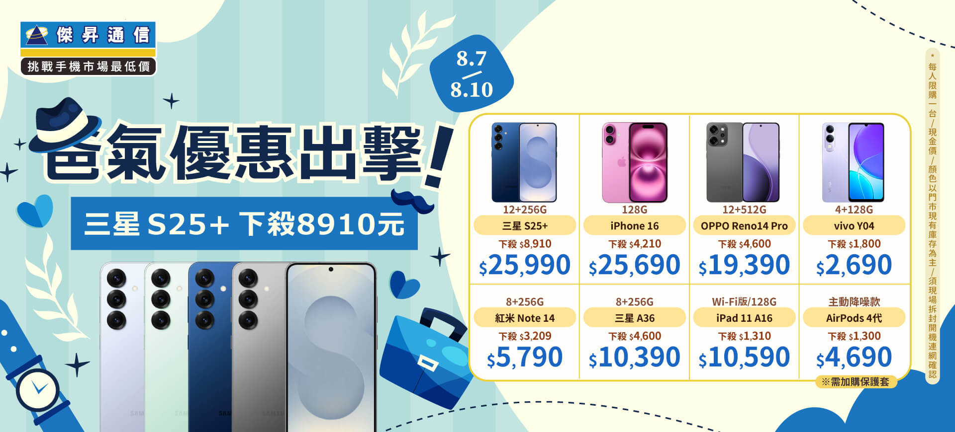 父親節送禮,有沒有考慮選購新手機或平板,幫老爸升級?傑昇通信自即日起至8月10日,推出《爸氣優惠》快閃活動,包括iPhone 16系列88折優惠、三星Galaxy S25旗艦最高現省萬元、5G新機紅米Note14免六千,全系列手機、平板強勢下殺。