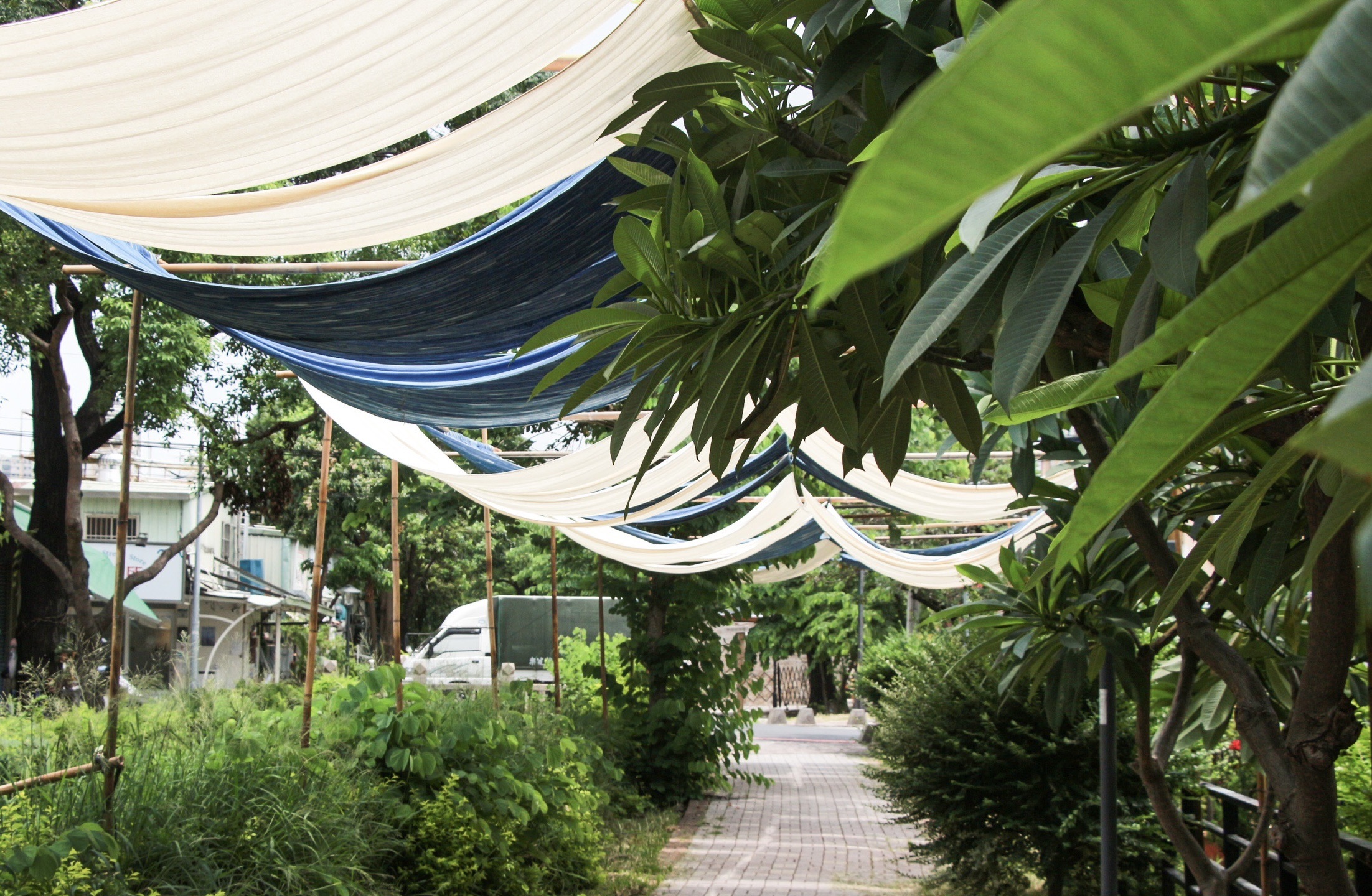 圖說:「藍脈流光市集」透過一千尺的植物染布與布料裝置,重現曹公圳的流動節奏與生命脈動。(圖片來源:高雄市經發局提供)