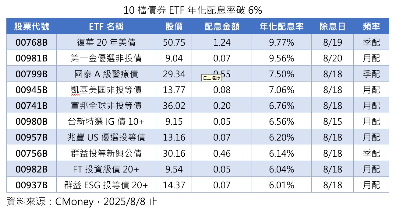 Cmoney資料顯示,8月共有45檔債券ETF除息,其中,2檔已在月初除息,接下來還有逾40檔即將在陸續登場,其中有10檔,年化配息率破6%,甚至有2檔逼近10%,包括季配息的復華20年美債(00768B),將在19日除息;以及月配息的第一金優選非投債(00981B),將在20日除息。