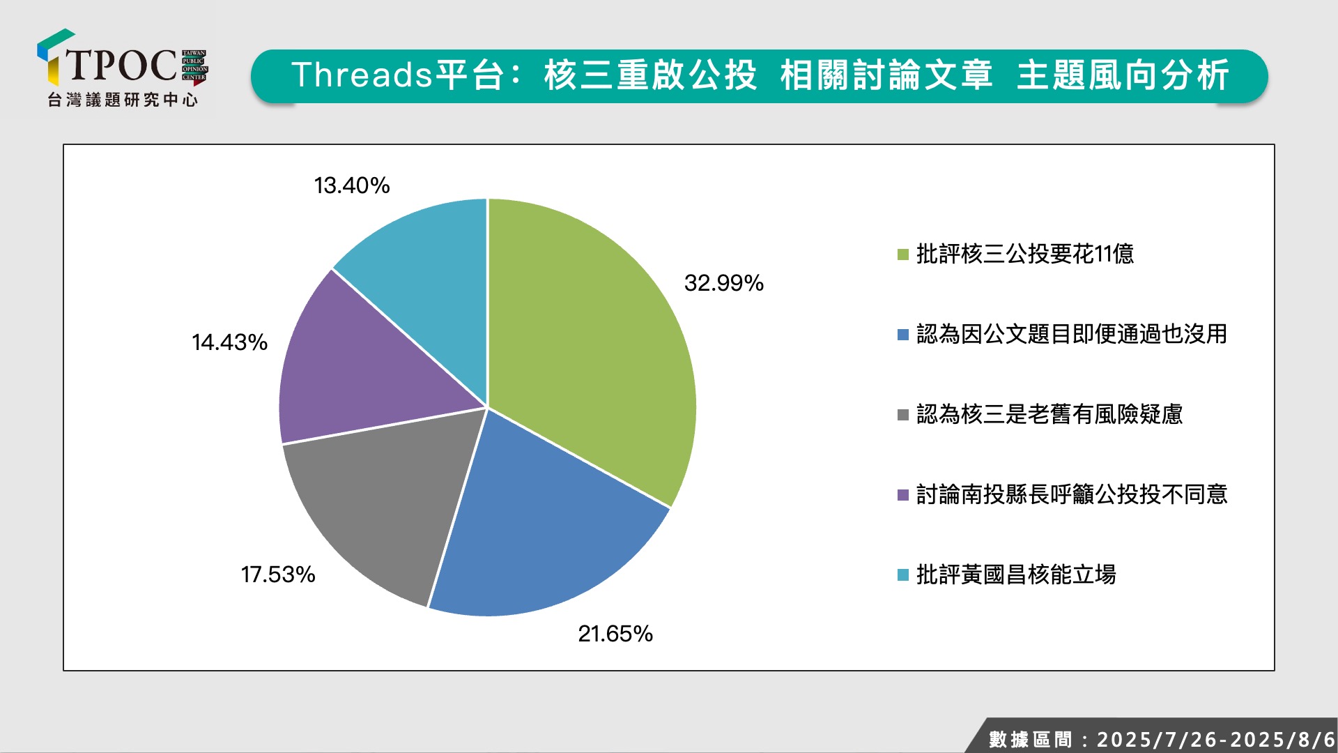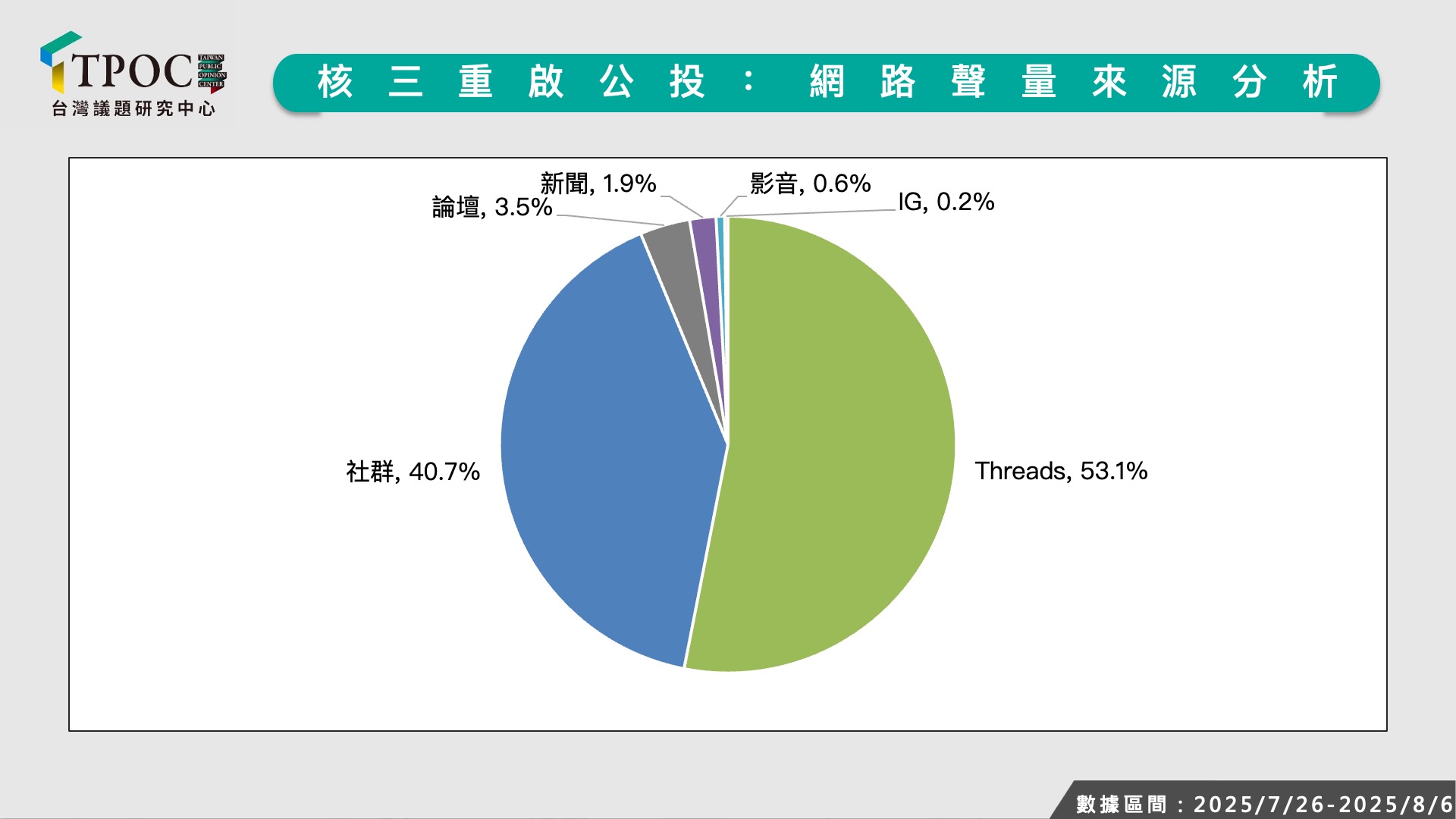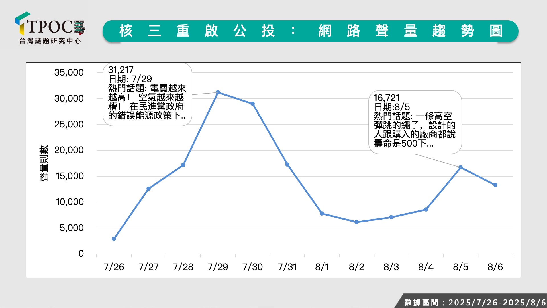 TPOC台灣議題研究中心透過QuickseeK快析輿情資料庫,觀察今年7月26日至8月6日之間,網路輿情對「核三重啟公投」的看法,調查期間內每日平均聲量約落在1.4萬則左右,表現並不差。其中第一個聲量高峰,出現在7月29日,當天台灣民眾黨透過Threads等社群平台,質疑為了填補核電退場留下的缺口,只好「火力全開」,讓居民吸著更多的懸浮微粒與空污,並揭露過去3年補貼台電3千億元,平均電價同步上漲共34%,呼籲透過公投「矯正」民進黨政府用意識形態治國,引發網路激烈正反論戰,單日聲量衝破3.1萬餘則,隔天也有2.8萬多則討論熱度。第二個聲量高峰則出現在8月5日,有民眾在Threads發文表達反對公投立場,提及「為什麼你願意拿屏東人的生命重啟核三?」,同樣吸引不同意見的網友留言討論,單日聲量約1.6萬多則左右,顯示此議題持續「發燒」,具備一定討論熱度。