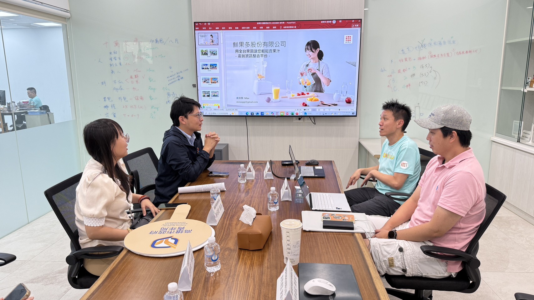 ↑圖說:「鮮果多」團隊向青年局長林楷軒(左二)介紹公司創業歷程,雙方還就青創補助、利息補貼及品牌輔導等相關資源交流彼此看法。(圖片來源:高雄市青年局提供)